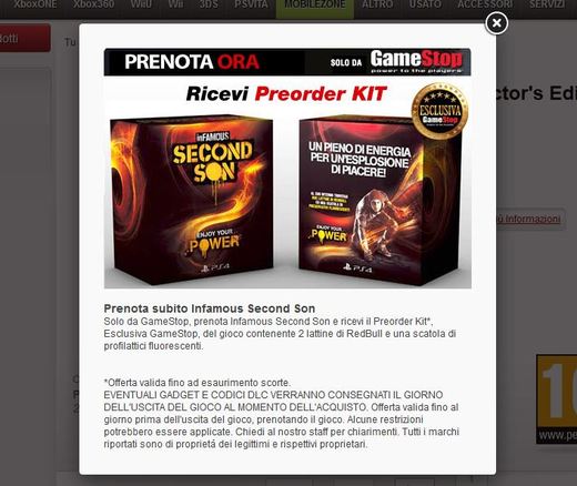 Gamestop-kauppaketju Italiassa tarjosi ainakin hetken aikaa Infamous: Second Son -pelin ennakkotilaajille Red Bullia ja pimeässä hohtavia kondomeja