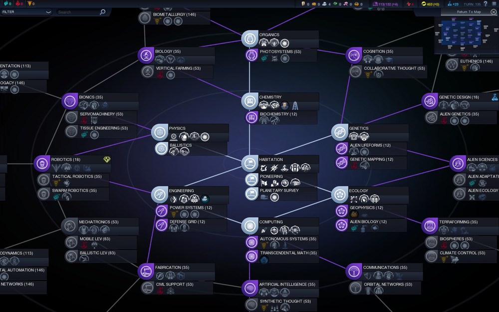Ei kyseessä silti ole aivan pelkkä grafiikoiden vaihto. Uusi maailma tuo mukanaan uudenlaisia lainalaisuuksia, eikä vähiten siksi, että planeettaa asuttavien alieneiden biologia ja teknologiat ovat uudisasukkaille vieraita. Muutenkin teknologian kehitys alkaa luonnollisesti aivan eri pisteestä kuin kivikirveitä rakentelevilla alkuasukkailla, ja mielestäni teknologiapuu on myös järjestetty nyt selkeästi pää- ja aliosioihin. Civilizationin "social policyt" on korvattu hyvejärjestelmällä (Virtue), jossa kansakuntaansa voi kehittää tiettyjen hyveiden suuntaan ja saada sen kautta bonuksia. Jokaisella kansakunnalla on myös oma mieltymyksensä (Affinity), joka määrittää, miten avaruusihmiset planeetan kanssa vuorovaikuttavat ja millaista voittoa he tavoittelevat.