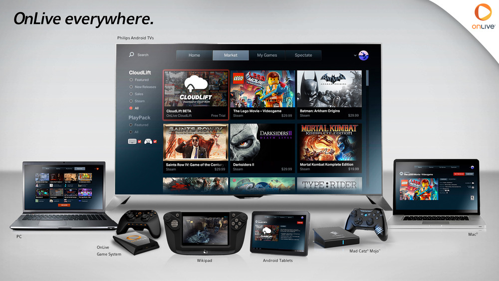 Yhdysvalloissa ja Iso-Britanniassa jonkun aikaa toiminut OnLive laajentaa nyt Pohjois-Eurooppaan, kun mukaan on saatu monien pelijulkaisijoiden lisäksi Philips, jonka uusi Android-pohjainen äly-tv sisältää OnLive-sovelluksen vakiona. Onlive siis striimaa PC-pelejä datakeskuksista ympäri maailmaa pelaajan ruudulle pelattavaksi, oli ruutuna sitten älytöllö, PC, Mac, tai Android-laite. IOS- ja Windows Phone -tukeakin jo lupailtiin. Kunhan samaa wifi-yhteyttä ei ollut hamuamassa puolenkymmentä median edustajaa samanaikaisesti, pyöritti Philipsin jätti-tv esimerkiksi Batman: Arkham Originsia vailla huomattavaa lagia. Verkkopiuhan irrotus laitteen takaa pysäytti pelin sijoilleen ja kun se kytkettiin takaisin, peli jatkui, kuin mitään ei olisi tapahtunutkaan.