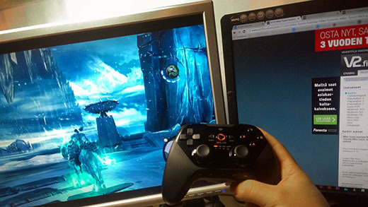 Ohjain on hieman nykykonsoliohjaimia isompi, mutta niistä selkeästi oppia ottanut. Sen saa sekä ladattua USB:stä, että käyttämään AA-paristoja. Bruce Grove kertoi, ettei ohjainten myynti ole heidän pääbisneksensä, mutta kapulan suunnittelussa keskityttiin kuitenkin ergonomiaan ja viiveettömyyteen. Ohjaimen mukana tuleekin oma wireless adapter -usb-palikkansa. Omiin kouriini se sopi ihan mukavasti, vaikka ei aivan niin hyvin kuin PS4- tai X1-ohjain. Sen luvataan toimivan myös useimpien Android-laitteiden kanssa. Olen konsolipelaaja ja ohjaimen kanssa DarkSiders II:a pelatessani fiilis oli täysin sama kuin pelikonsolilla.