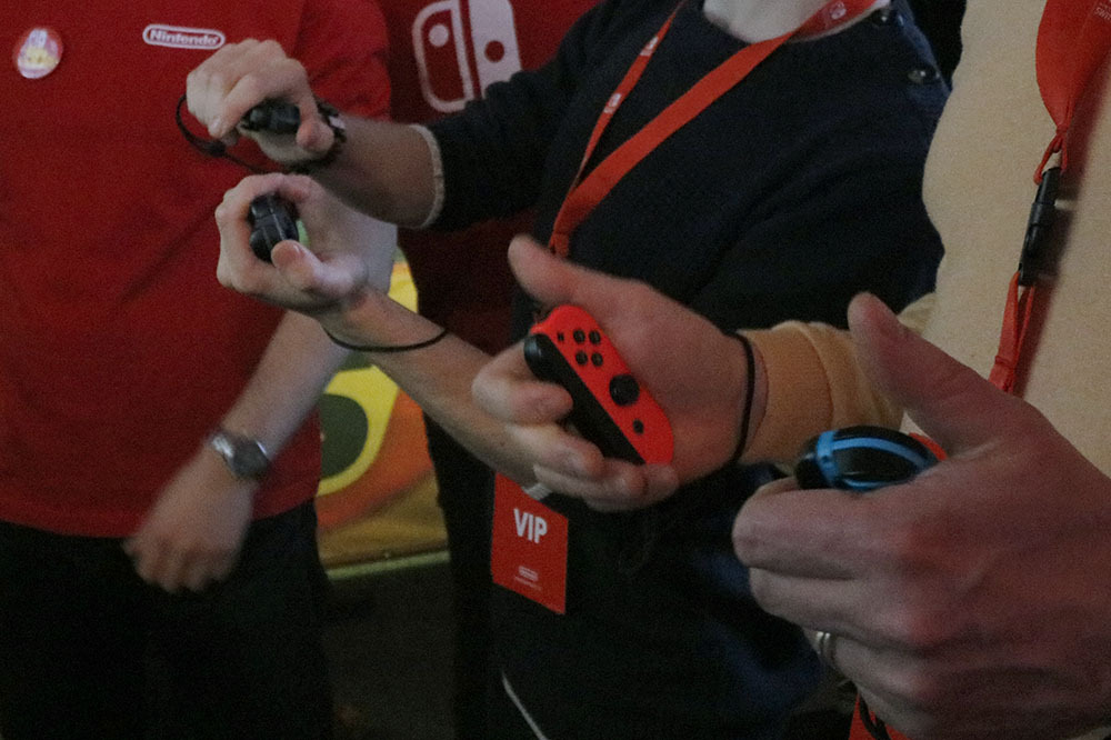 Tupaten täynnä väkeä olevassa tilaisuudessa ei päässyt vielä rauhassa koskettelemaan ja kääntelemään Switch-konsolin kaikkia osasia, ainoastaan Joy-Con-ohjaimet sai irrallisina käsiinsä muutamaa peliä testatessa ja niistä lisää kyseisten pelien kohdalla. Mysteeriksi jäi siis vielä muun muassa se, miltä koko konsolin paino tuntuu käsissä pidellessä - laitteisiin oli turvallisuussyistä ruuvattu kiinni vahva taustalevy ja painava kaapeli.