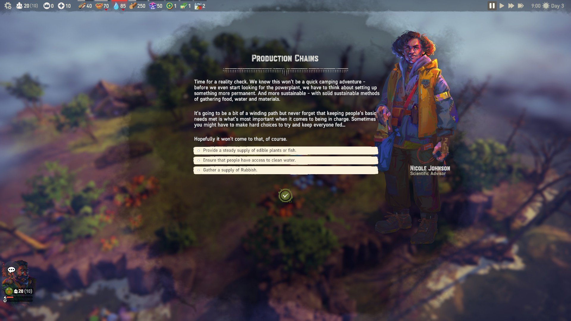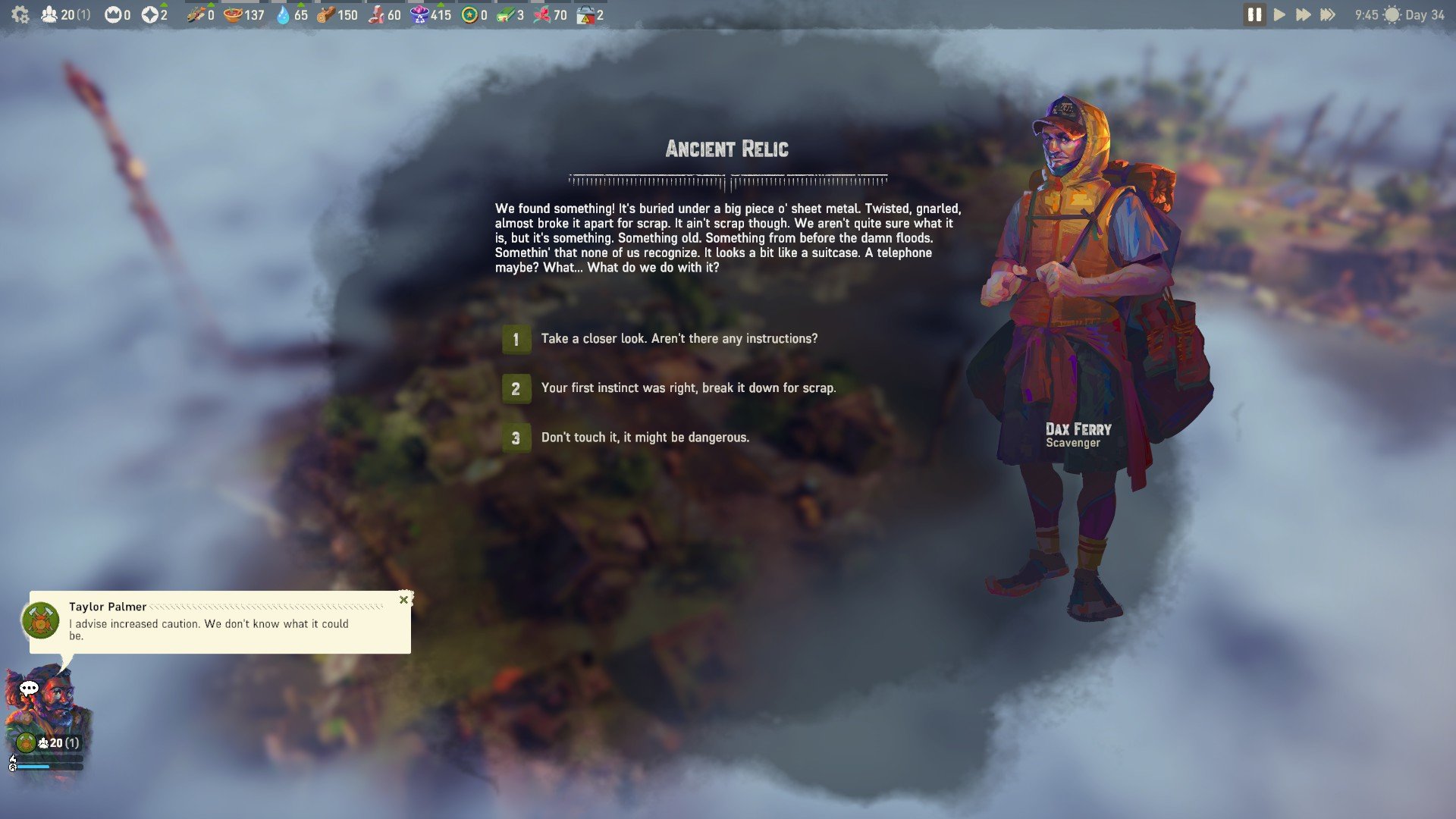 Frostpunkin yhteiskuntapohdinnan lisäksi Floodland muistutti minua – yllättävää kyllä – Minecraftista. Varsin suuri osuus pelaamisesta keskittyi resurssien keräämisen lisäksi niiden jalostamiseen. Survival-peleistä tuttu kaava oli tunnistettavissa myös isometrisestä vinkkelistä: kerää marjoja, rakenna tehokkaampi marjojen keräystapa, kerää enemmän marjoja, kehitä kerääjiä taas eteenpäin – ja niin edelleen. Romahtanutta maailmaa tutkiessa ansaitaan teknologia- ja kokemuspisteitä, joiden avulla klaani voimistuu ja kadonnut tekninen osaaminen löytyy uudelleen. Tutkiminen tuo mukanaan myös satunnaisgeneroituja pulmia, kuten oudolta haisevan vesifiltterin: onko sinulla varaa pysäyttää vedenpuhdistus filtterin tutkimista varten, vai riskeeraatko juomaveden tärveltymisen?