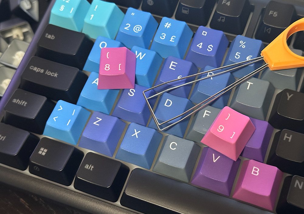 Mukana tuli myös näppäinhattusetti, jossa yhdistyvät liukuvan väripaletin ja mustat näppäimet yhdistävä ilme. Näppäinhattujen luvataan sopivan useimpiin näppäimistöihin, mikä pitää varmasti paikkansa. Hatut ovat hieman suuremmat kuin GMBK 75 %:n omat ja läpinäkymättömät, joten RGB-efektiä ei voi niiden läpi hehkutella. Kauniin väriset ja tasalaatuisen näköiset PBT-hatut kuitenkin asentuvat helposti ja lähtevät nopeasti poiskin, jos näppäimistön ilmettä haluaa muuttaa. Jos näppis kaipaa pientä piristystä, tällaista settiä kannattaa ehdottomasti harkita.