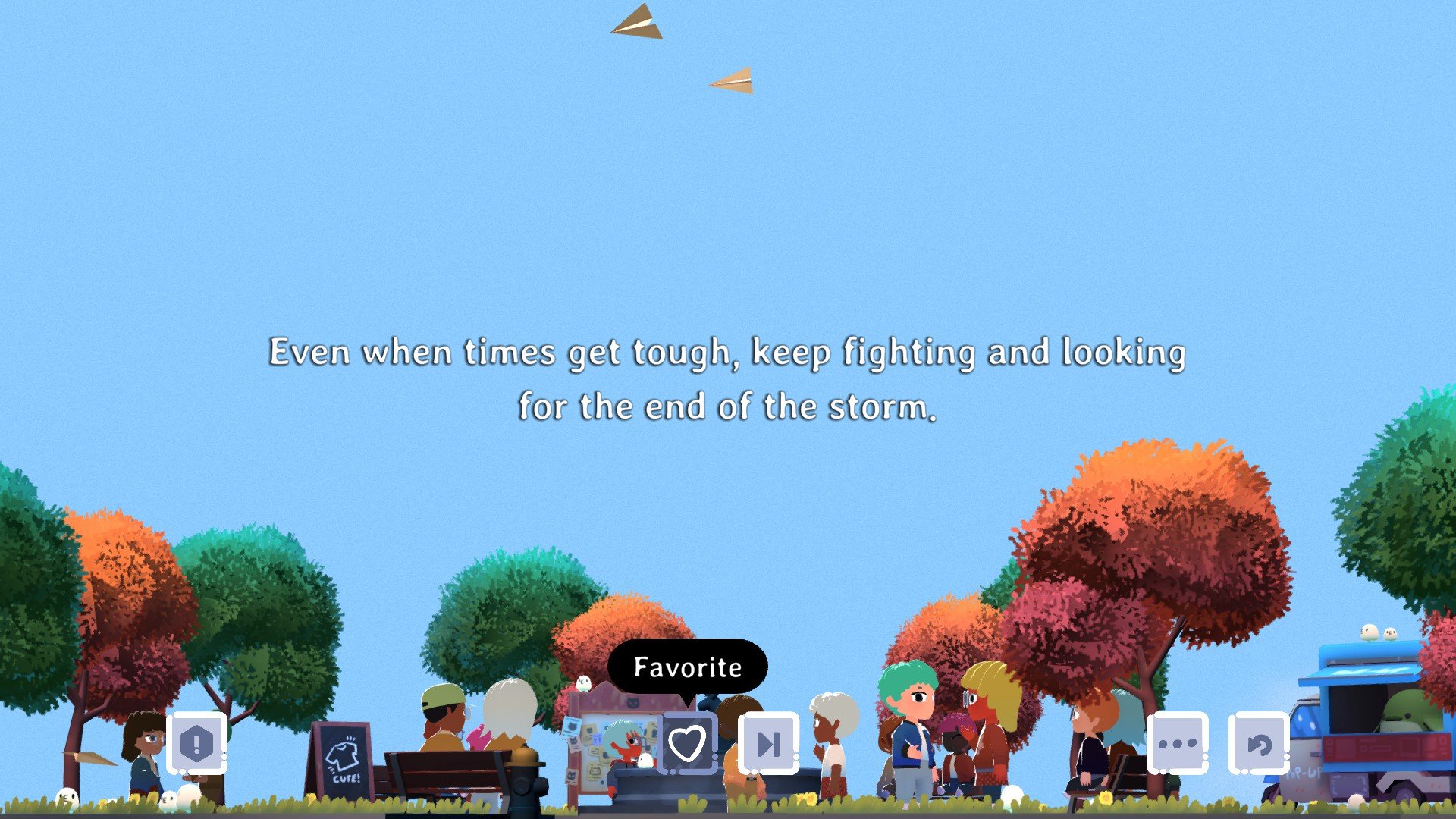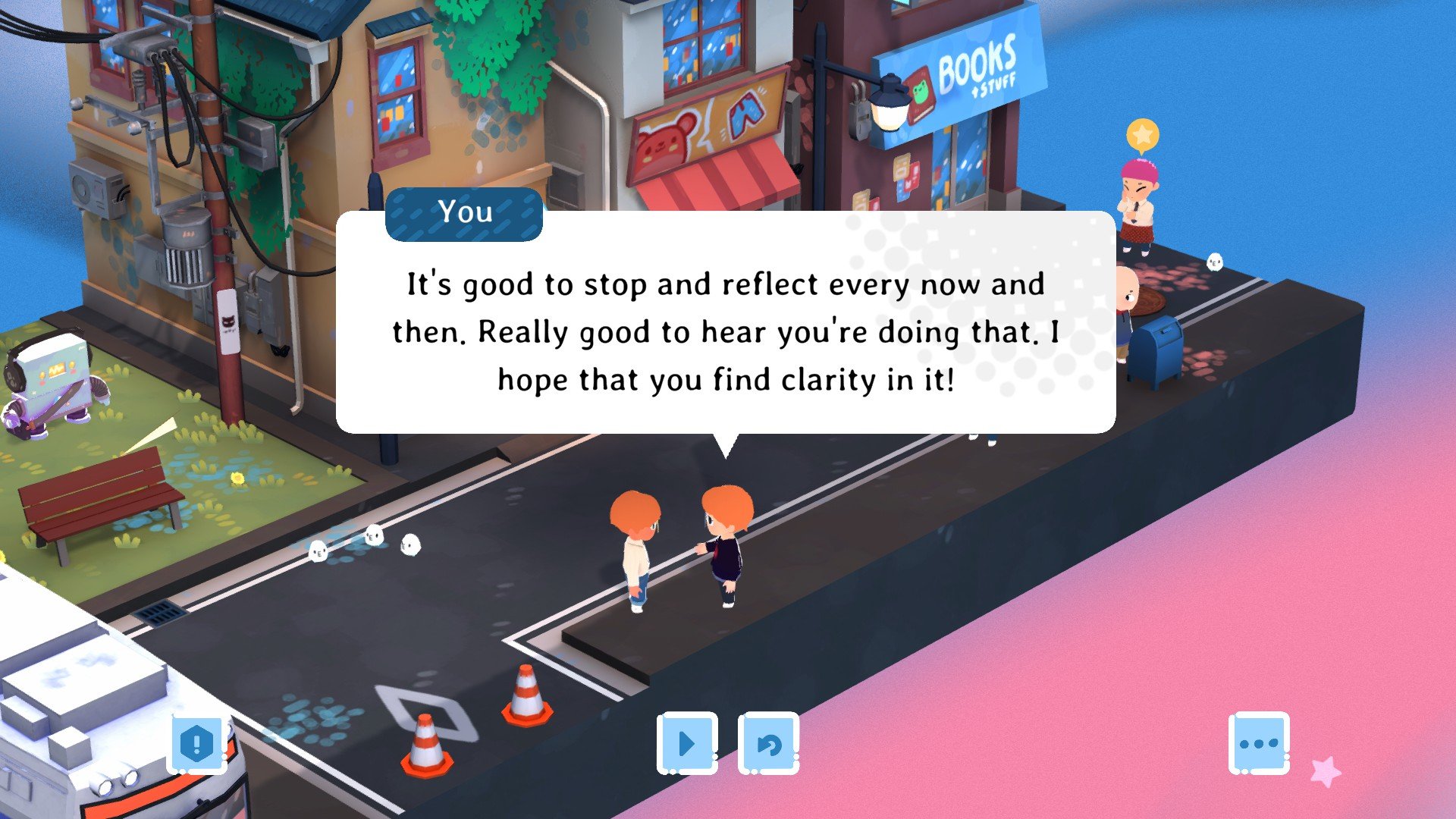 Vaikka eri kaupunginosat tarjoavat erilaisia asioita – kuten fiksuille neuvoille omistetun vuorenhuipun tai ketjukirjeitä täynnä olevan puiston – kaikki alueet pohjautuvat samaan asiaan, eli anonyymeihin viestittelyihin ventovieraiden kanssa. Siinä missä “kotona” kirjoitetut viestit sisältävät huolia ja mieltä askarruttavia asioita, kaupungilta löytyvät paikat tarjoavat mahdollisuuden rennompaan kommunikointiin. Levykaupassa jaetaan ja kysytään luku-, katselu- ja pelisuosituksia, kahvilassa taas lausutaan runoja. Kind Words 2 on ottanut yksinkertaisen päämekaniikan ja laajentanut sitä varsin onnistuneesti eri suuntiin: yhden tunnetilan jakamisen sijaan Kind Words 2 tuntuu enemmän kaikkia kommunikoinnin eri muotoja palvelevalta alustalta.