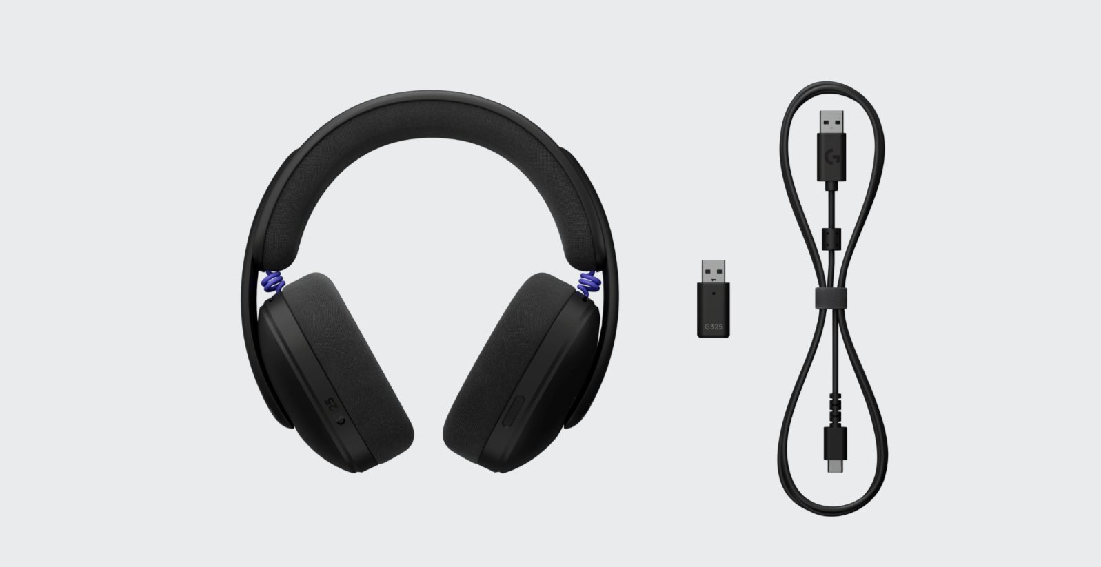 Lightspeed G325 edustaa suunnittelultaan sitä Logitechin nykyistä tyyliä. Kuulokkeet ovat ulkoisesti paljon hillitymmät kuin perinteiset peliluurit ja tuovat hyvin vahvasti mieleen viime vuonna arvioimamme Logitech G321 -headsetin, ei tietenkään sattumalta. Kuulokkeet ovat enimmäkseen mustat tumman harmailla aksenteilla. Väriä tuovat liilat kaapelit, jotka yhdistävät kuulokekupit sankaan.