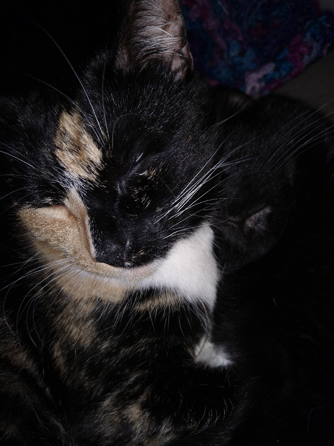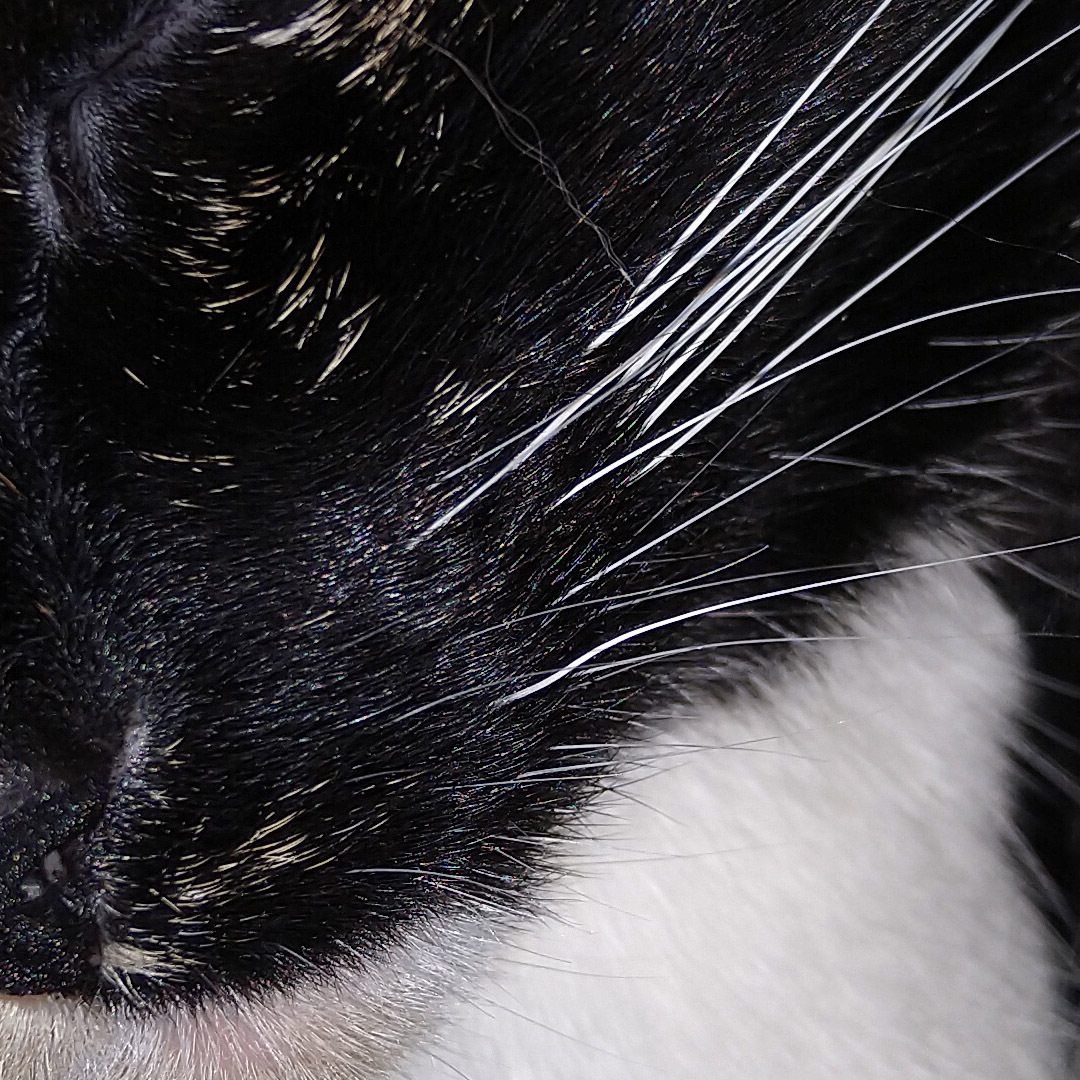 Käyttis on siis Pie, kuten uunituoreissa Android-luureissa pitäisikin olla. Nettikeskustelujen perusteella Motorolan puhelimet pidetään hyvin päivitettyinä, eikä mukaan ole lisätty turhaa tauhkaa. Muutenkin ominaisuuslista on hintaan nähden hyvällä tasolla ja vaikka kamerat eivät megapikseleillä pröystäilekään, f/1.7-aukko, optinen kuvanvakaus (OIS) ja AI-ohjelmisto saavat aikaan jännittävän hyvää jälkeä. Alla pimeässä, kameran salamalla otettu kuva kissastani ja sen alla rajattu otos sen yksityiskohdista. Voi kissan viikset!