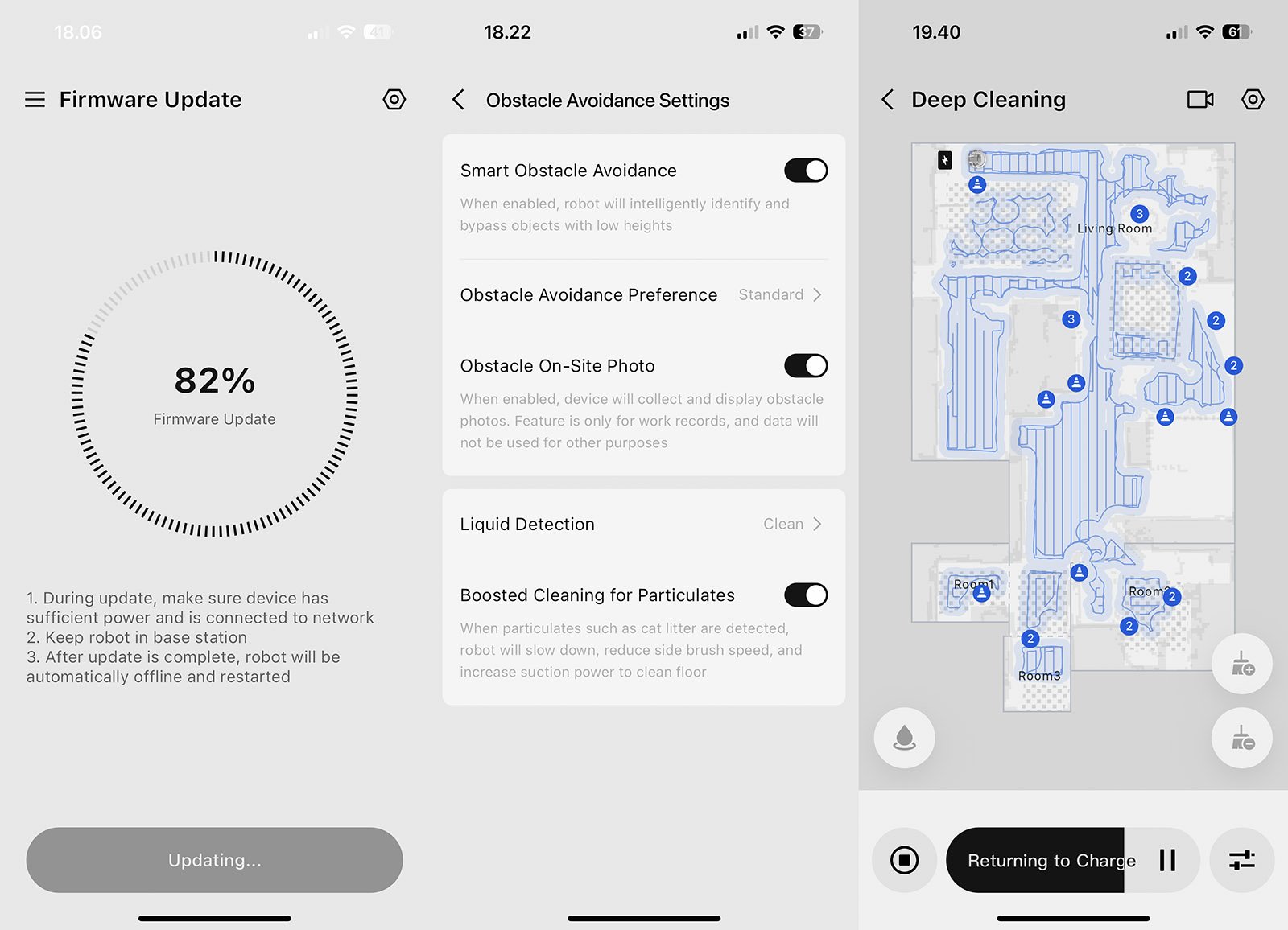 Sovellus on myös varsin vähäeleinen, sillä joko onnistuin epähuomiossa kytkemään siitä ilmoitukset pois päältä tai sitten niiden kytkemistä päälle ei alkujaankaan tarjottu. Tästä taas seurasi se, että kun robotti jumittui paikoilleen tai siltä loppui puhdas vesi, en saanut asiasta mitään ilmoitusta. Roborockin kanssa prosessi on nimittäin ollut, että kun päivän aikana saan tiedon robon joutumisesta perätilaan, ilmoitan siitä perheen WhatsApp-ryhmässä ja ensimmäisenä kotiin saapuva sitten nostaa laitteen takaisin reitilleen tai täyttää vesisäiliön. Tämä olisi pienempi ongelma, jos laite osaisi itse väistellä vaaranpaikkoja, mutta senkään suhteen ROMO P ei vielä ole mitenkään erityisen taitava. Tunnistus sinällään toimii ja on usein jopa oikeassa, mutta robotin reagoinnissa tunnistettuihin esineisiin on vielä tekemistä. Myös klassinen ”tunnistan, että tässä on nippu johtoja, mutta ajan silti suoraan siihen, takerrun piuhoihin ja pudotan moppini” nähtiin.