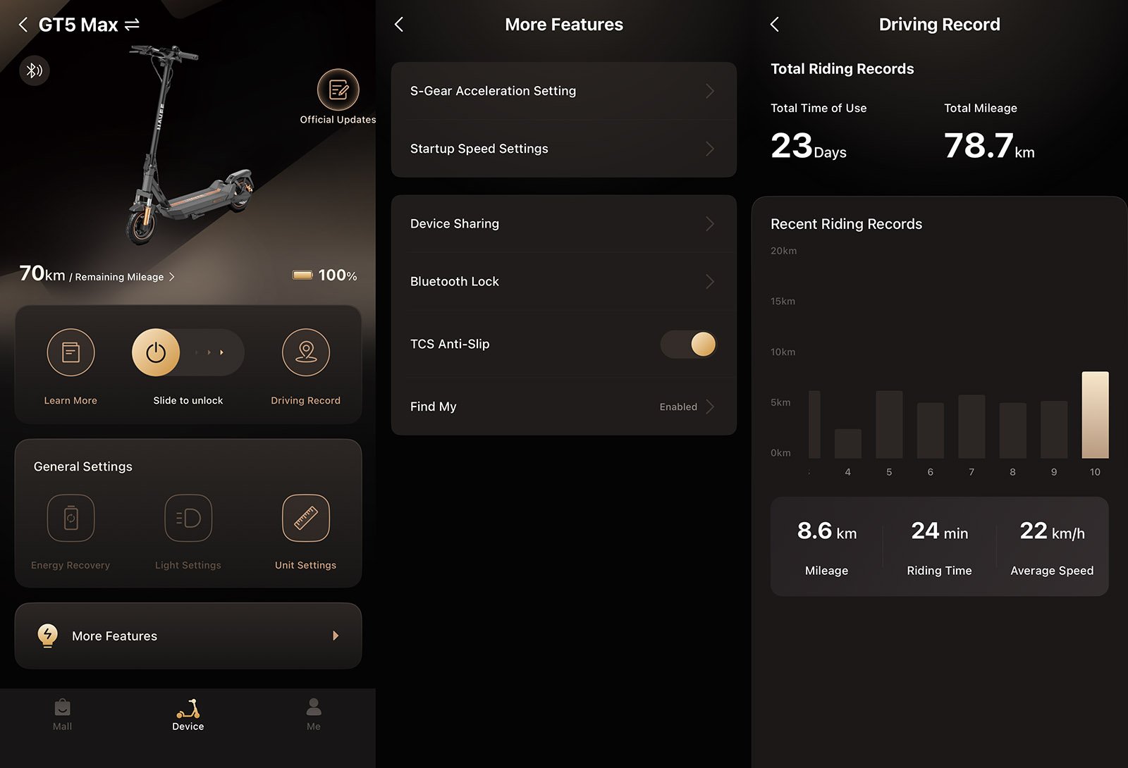 Jos laudalle haluaa lisätä muita käyttäjiä, heidänkin pitää asentaa sovellus ja luoda tili, jonka jälkeen omistaja myöntää käyttöoikeuksia – vähän kuin Tesloissa. Muuten onnistuu käytännössä vain lyhyt koeajo, sillä virran katkaisun jälkeen tarvitaan taas lupaa avaukseen tai laite alkaa huutaa kovaan ääneen. Skuutissa on myös sisäänrakennettuna Applen Find My -systeemin kanssa yhteensopiva lähetin, mistä lisäpisteitä.