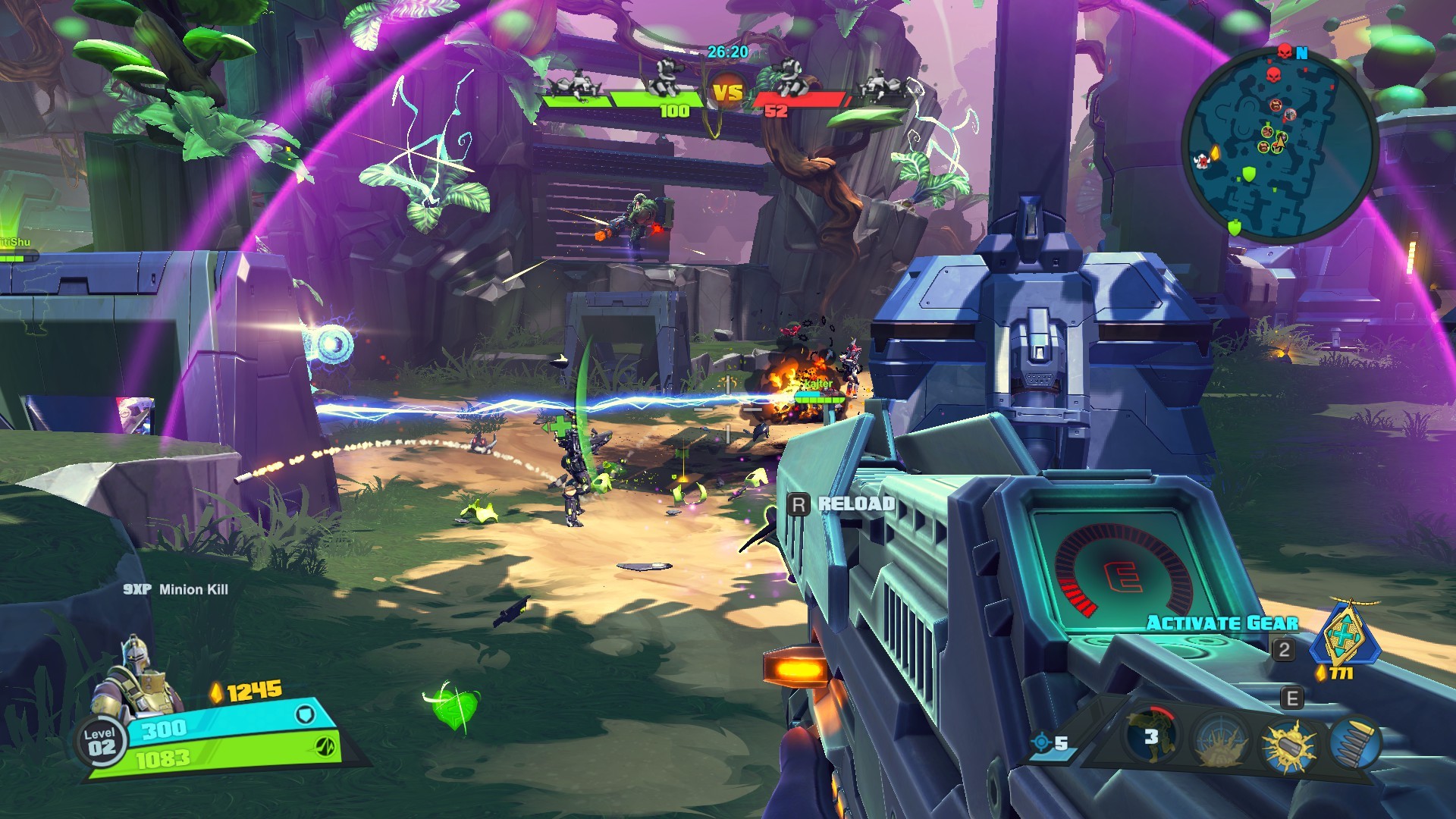 Kun inventaario on täytetty sopivalla tauhkalla ja sankarit ovat käytössä, suunnataan moninpelin autuaille niityille räiskimään vastapuolen sankarit seulaksi. Battlebornin 5v5 PvP:hen kuuluu kolme eri pelimuotoa: Capture on perinteistä kolmen pisteen valtausta, Incursion rynnimistä kartan päästä toiseen ja Meltdown raiteilla liikkuvien minioneiden johdattamista määränpäähänsä. Capture on pelimuodoista selvästi helpoiten lähestyttävä; tuttu pelimuoto ja tiiviit kentät tarjoavat hektisiä otteluita, jotka ovat usein ohi minuuteissa. Incursion ja Meltdown taas lainaavat oppeja MOBA-peleistä, sekoittaen soppaa raiteita pitkin kulkevilla minioneilla. Meltdownissa tekoälyn ohjastamat pikkurobotit saatetaan sulatusuuniin ennenkuin vastapuoli ehtii tehdä samoin, Incursiossa minionit auttavat väylällä puskemista kohti vastustajan päätyä - ja siellä odottavaa jättirobottia. Jokaiseen pelimuotoon kuuluu 2 mappia, joten painopiste on selvästi karttojen ulkoa oppimisessa ja eri sankareiden mestaroinnissa.
