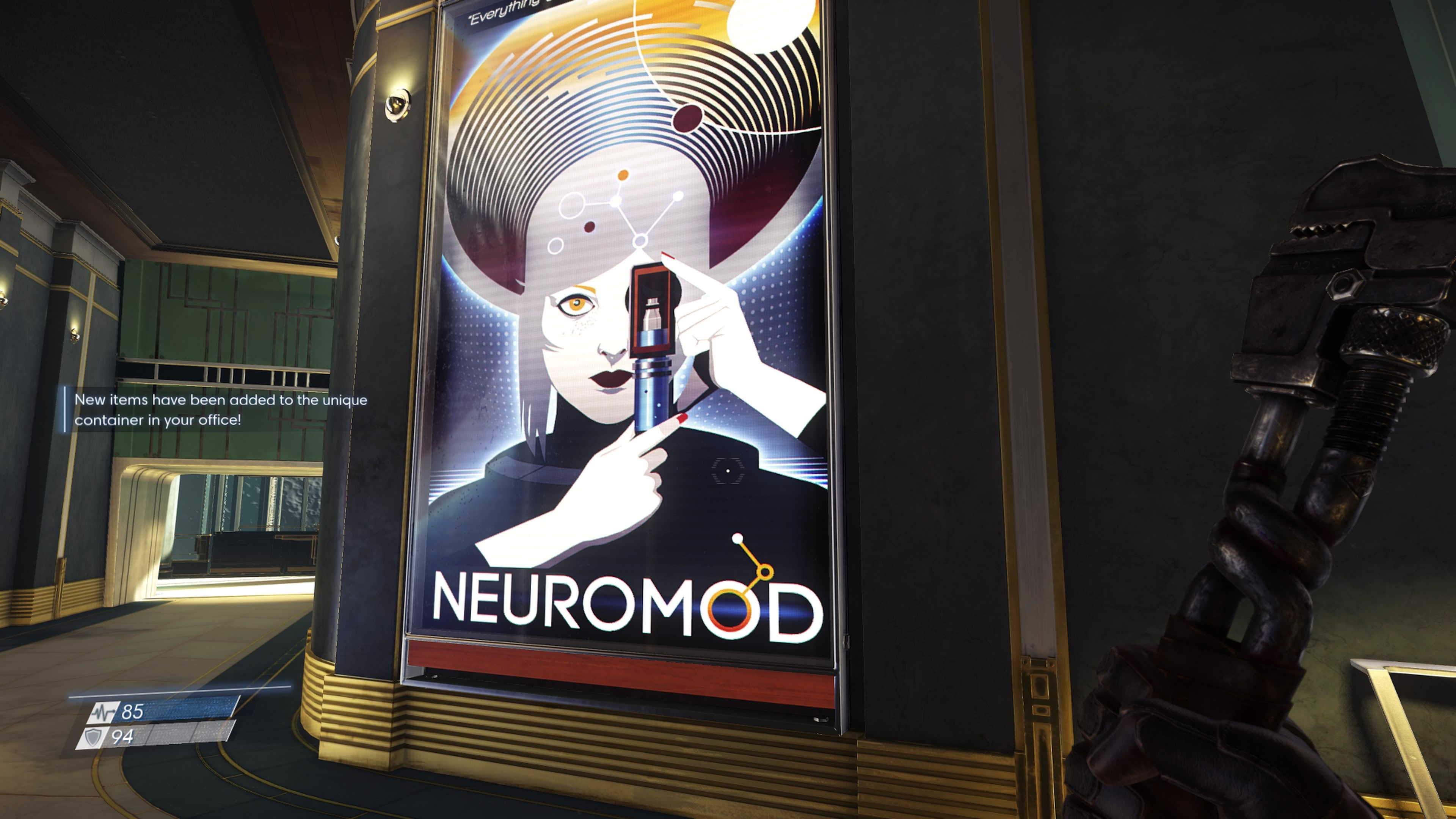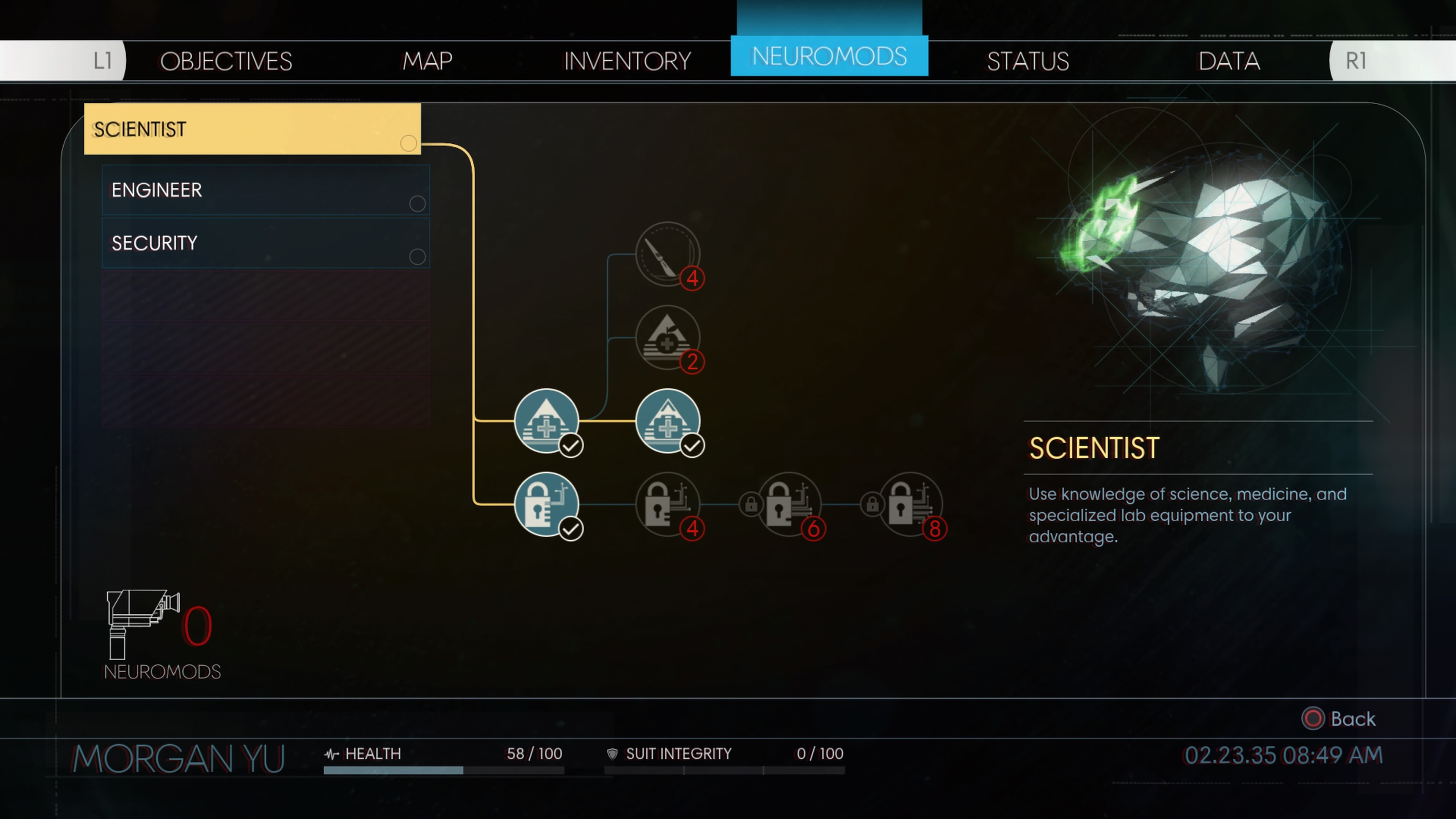 Morganin taitojen päivittäminen onnistuu neuromods-palikoiden avulla. Yllätyksekseni täytyy sanoa, että Preyn kykypuu on laaja. Taitoja pystyy hinkkaamaan aina telepatiasta hakkerointiin. Valittavissa ovat myös normaalit ominaisuudet kuten kestävyys, latausnopeudet ja suojuksen parantaminen. Päivittämiseen tarvittavia palikoita ei turhan usein Morganille lahjoiteta, joten niiden löytäminen piilopaikoista on tärkeää. Tietenkään piilojen sijainteja ei kerrota, joten ne löytyvät lähinnä sattumalta. Neuromods-palikoiden puute vaikeuttaa seikkailussa etenemistä, sillä kykypuun ominaisuudet ovat tärkeä osa Morganin pärjäämistä Typhoneita vastaan.