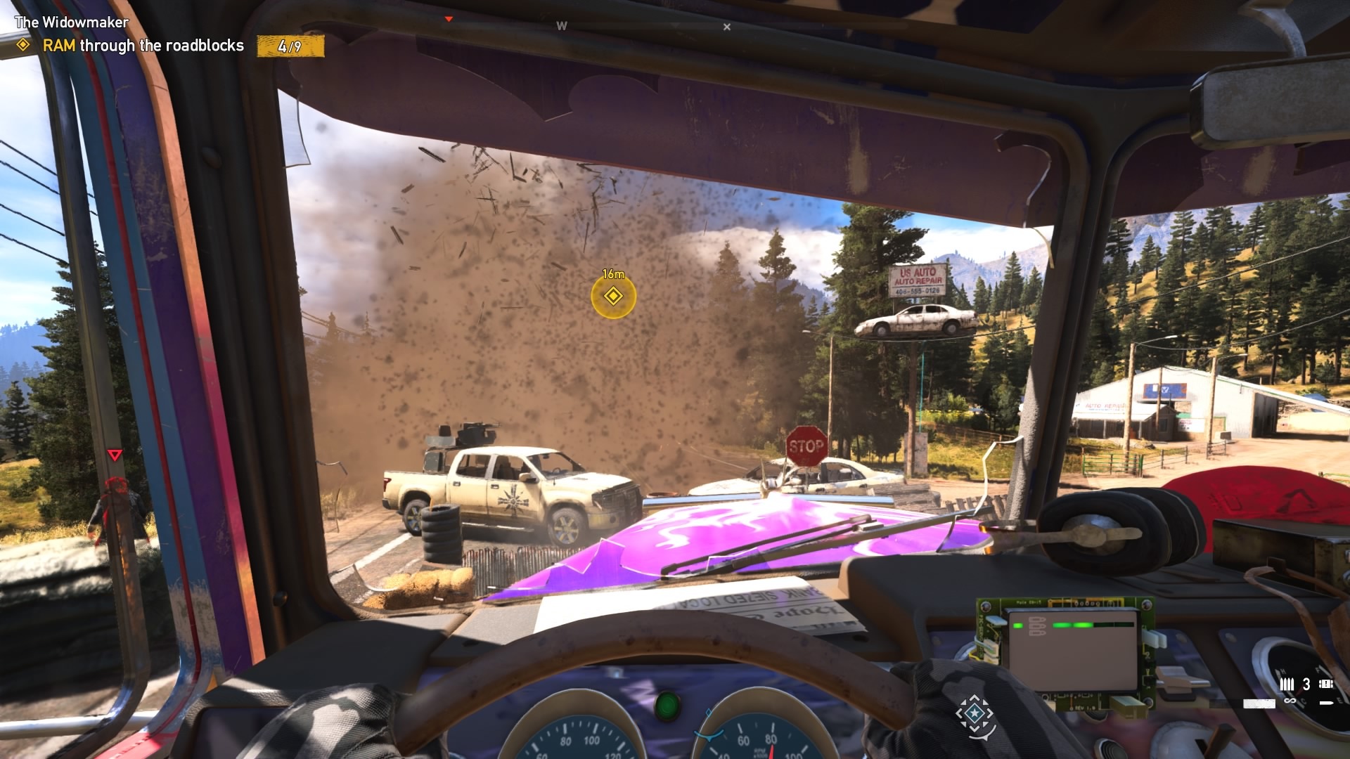 Miksi sitten pelata Far Crytä? Tarina on pliisu ja kaavakin hieman turhan tuttu. Onneksi niin ovat ne pelin hyvät puoletkin, sillä Far Cry 5 on yhä A-luokan hölmöilygeneraattori. Ei tarvitse kuin patsastella jollain tien pätkällä pari minuuttia niin on jo keskellä täyttä kaaosta. Ensin paikalle kaasuttaa kultistien panttivankiauto, jonka kuski tietenkin ammutaan rattiin (ja sitten kuski putoaa ovesta ja liukuu kuin teflonilla tietä pitkin horisonttiin). Paikalle saapuu lisää kultisteja, jotka törmäävät mönkijällään pakettiautoon ja räjähtävät, sytyttäen metsäpalon.
