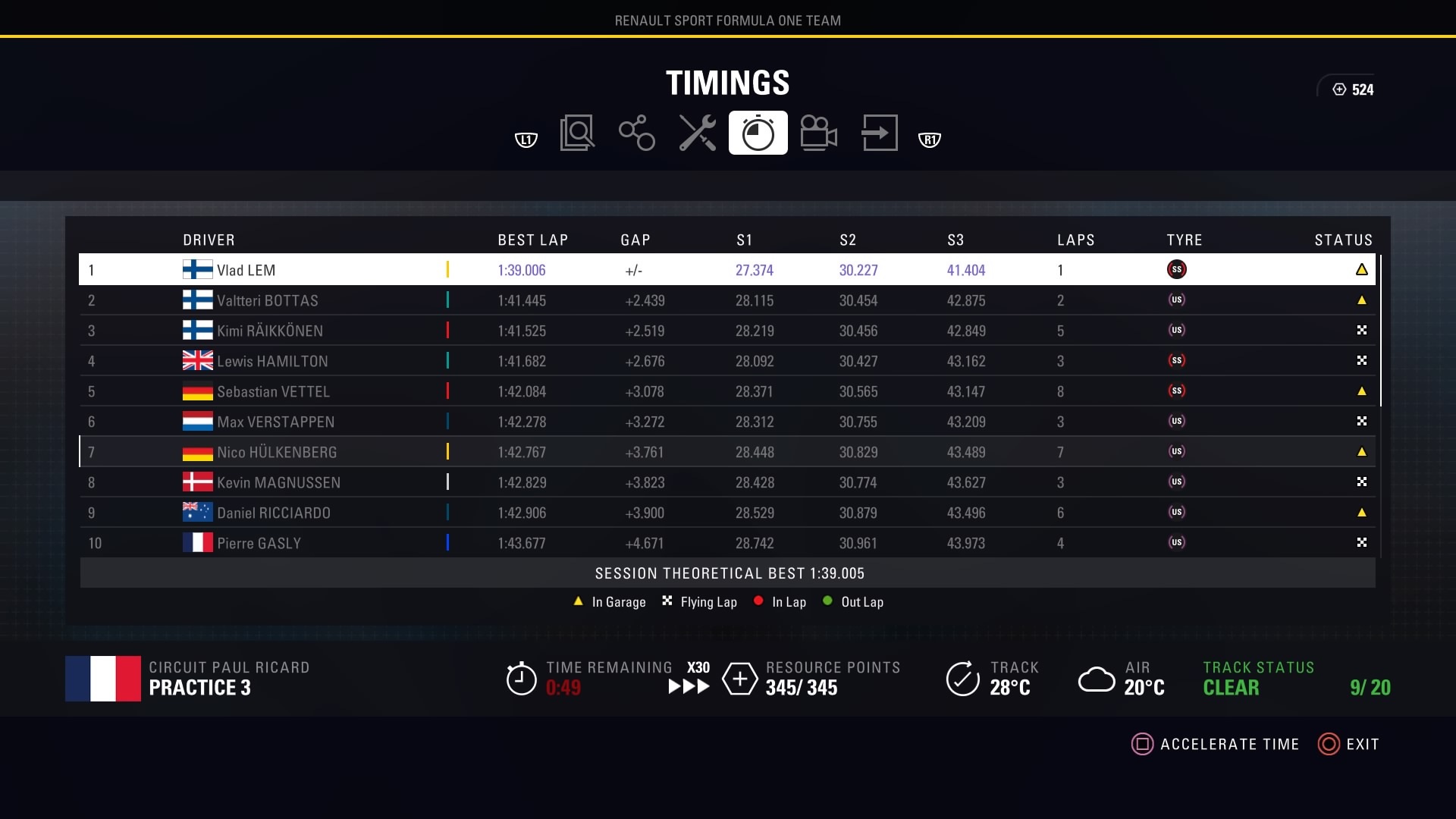 Oikeiden rattimiesten seuraan saa väsättyä oman kuskiavatarin, jonka voi istuttaa haluamansa tallin penkkiin. Uratilassa ei meriittejä katsella, vaan paikka lohkeaa valinnan mukaan niin kärkitiimeistä, välimallin talleista kuin puulaakimerkeiltäkin. Itse koin Renaultin tarjoaman keskinkertaisuuden mielekkäimmäksi, sillä sinikeltaisessa kärryssä joutuu tosissaan taistelemaan menestyksestään. Tai joutuisi, mikäli vaikeusastetta saisi hilattua kauden aikana ylöspäin. Alkuun sopivalta tuntunut ruuvi osoittautui nimittäin jo kauden puolivälissä aivan liian löysäksi.