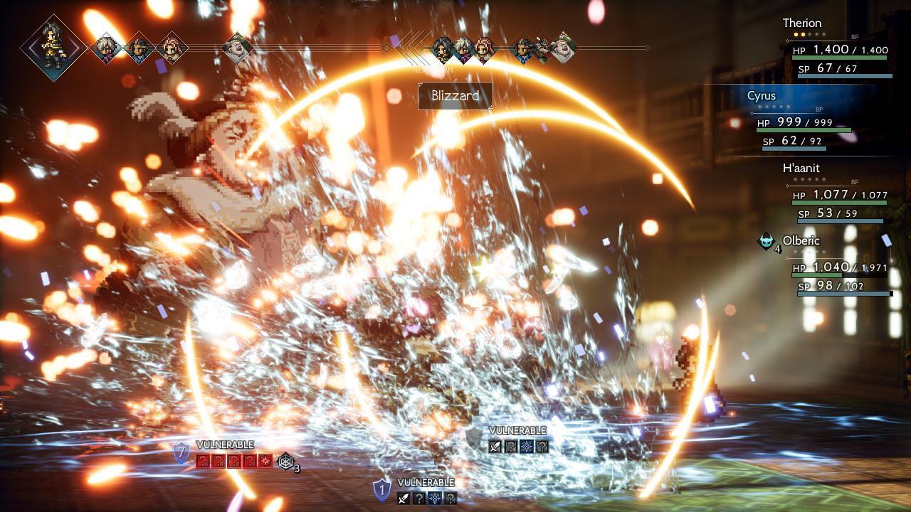 Peli on sukellus menneeseen myös muutenkin kuin ulkoiselta olemukseltaan. Nykyinen roolipelien trendi on ollut etääntyä perinteisestä vuoropohjaisesta toiminnasta, mutta Octopath on rohkeasti konservatiivinen. Taistelujen asetelma oli hyvin samanlainen kuin vanhojen NES ja Super NES -konsoleiden Final Fantasyissa. Vastustajat on toteutettu tyylikkäällä pikselitaiteella ja omat hahmot pysyvät piskuisina, samanlaisina lättänöinä, kuin ne ovat kartalla liikuttaessa. Modernin twistinsä peliin tuo taistelujen nopeatempoisuus. Liikkeiden animaatiot ovat lyhyitä ja napakoita, eikä turhaa odottelua juurikaan esiinny. Nopeasta temmosta huolimatta taistelut ovat todella, siis todella, pitkiä.
