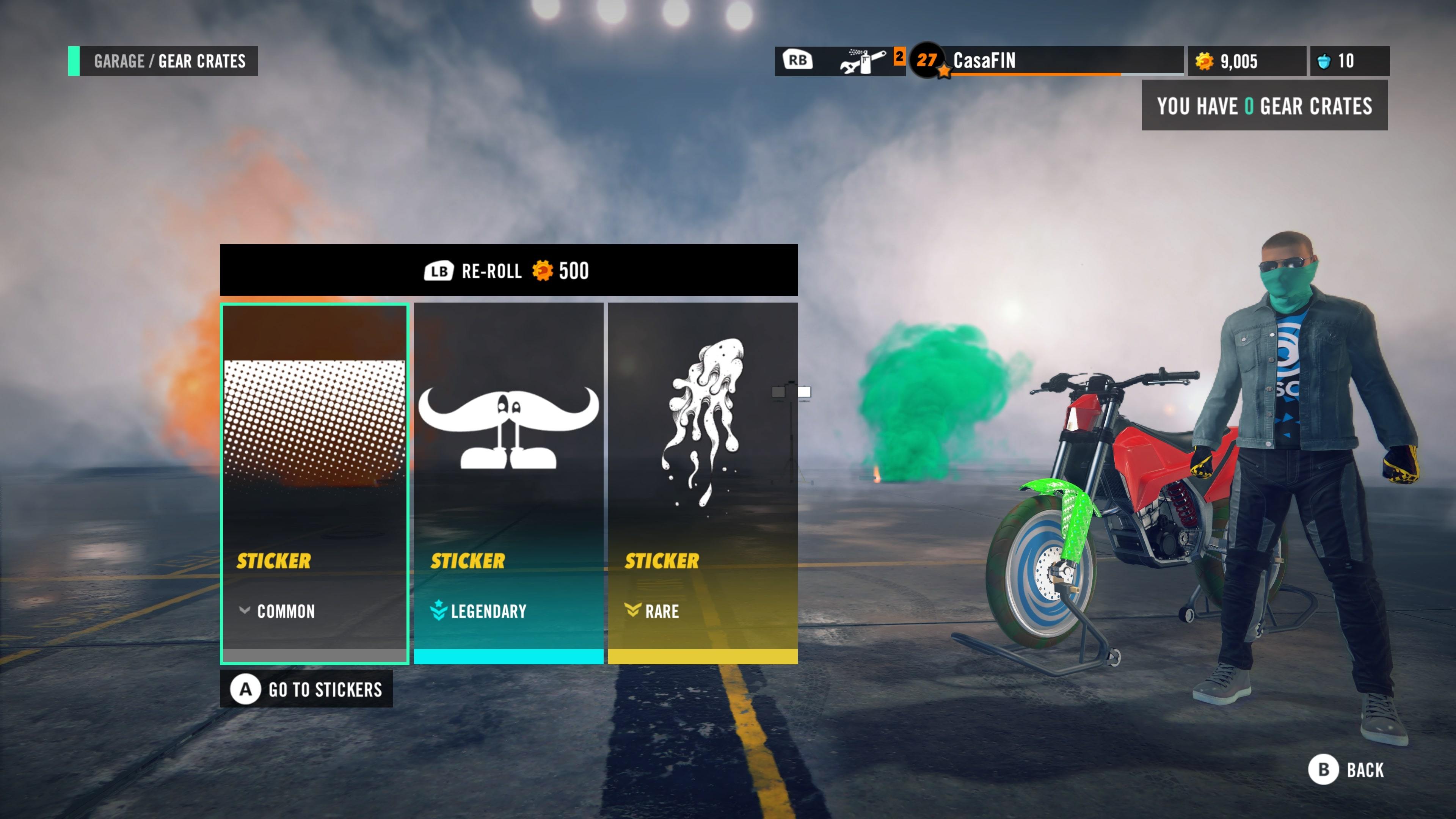 Ajotarvikkeita ja tarroja pelaajan valikoimiin lisätään loottilaatikoiden kautta, joita pelaaja ansaitsee muun muassa pelaajatason kasvaessa ja suorittamalla erilaisia pelimaailmaan ilmestyviä haasteita. Nämä kamalaatikot ovat siitä tylsiä, että niistä tuli enimmäkseen tarroja, ja minä kun en ole innostunut pyörän modailusta, niin nehän olivat täysin turhia. Sitten kun sain pelihahmolle uudet ajokengät, niin parhaassa tapauksessa ne olivat jo viidennet samanlaiset. Onneksi tuplakappaleet voi myydä pois ja esimerkiksi nopeuttaa ajokkivalikoimaan leikkirahalla ostettavien polkupyörän ja pikkumopon hankintaa.