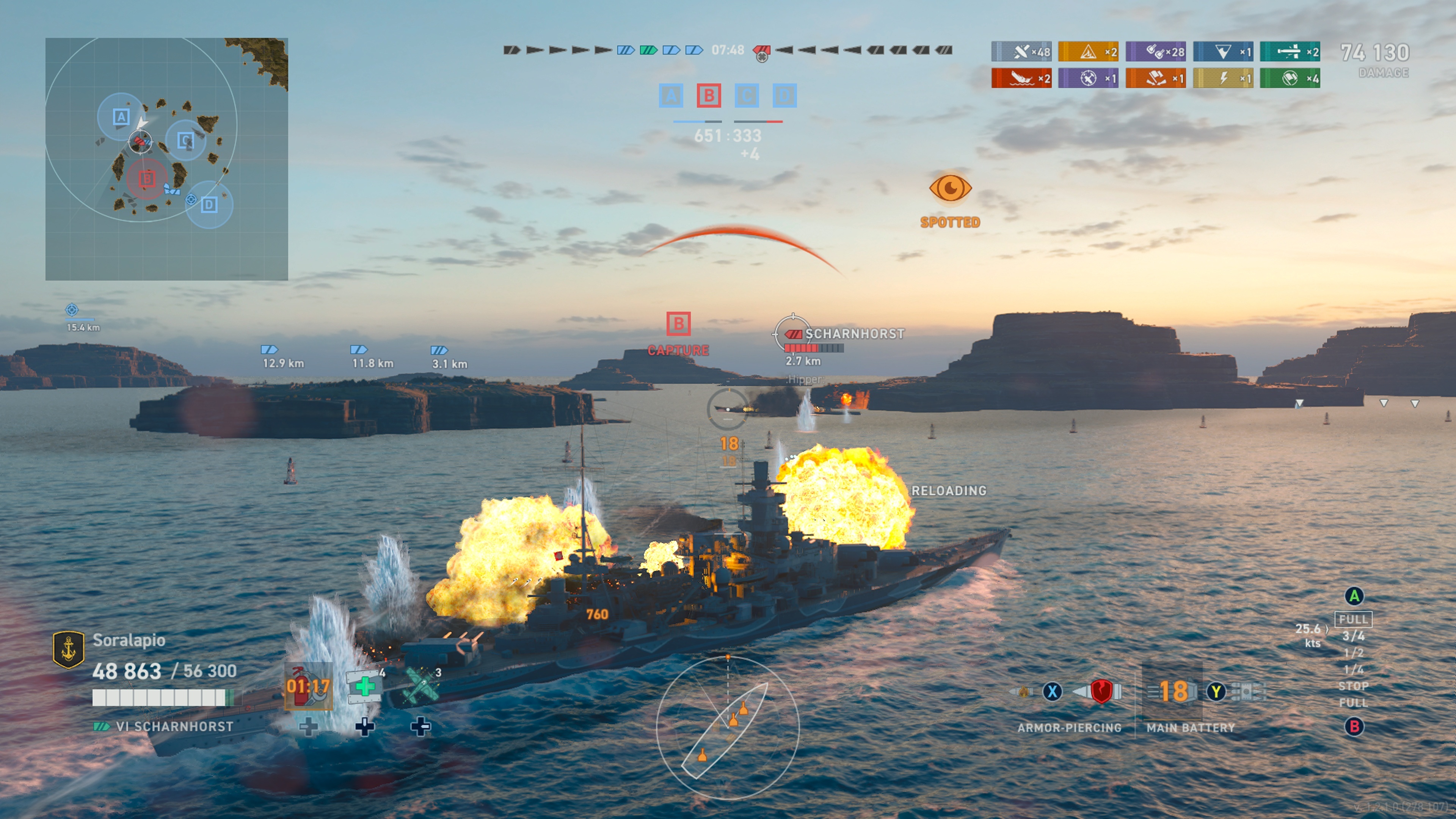 Tämä taktinen syvyys on juuri se juttu, miksi pidän World of Warshipsistä, samoin kuin se, että pelaaminen ei ole niinkään näädän refleksejä vaativaa sinkohippaa, vaan taktikointia, suunnittelua ja ennakointia. Laivat ovat painavia ja reagoivat hitaasti, joten siinä vaiheessa kun saaren takaa paljastuu vihollispaatti, on jo liian myöhäistä suunnitella sen suurempia. Virheet on tehty jo aikaa sitten ja tilanne olisi täytynyt lukea täysin eri tavalla.