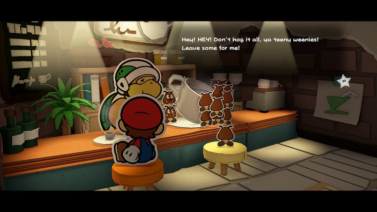 Paper Mario -pelit ovat aina loistaneet kirjoituksellaan, eikä Origami King tee poikkeusta. Matkalla kohtaa useita todella riemastuttavia kohtauksia, mainioita hahmoja, oikeasti naurattavia vitsejä ja pienempiä kätkettyjä yksityiskohtia, kuten vaikka perinteisten Mario-pahisten salaisen kahvilan, jossa shy guyt ja goombat juovat elegantisti espressoa ja keskustelevat filosofiasta.