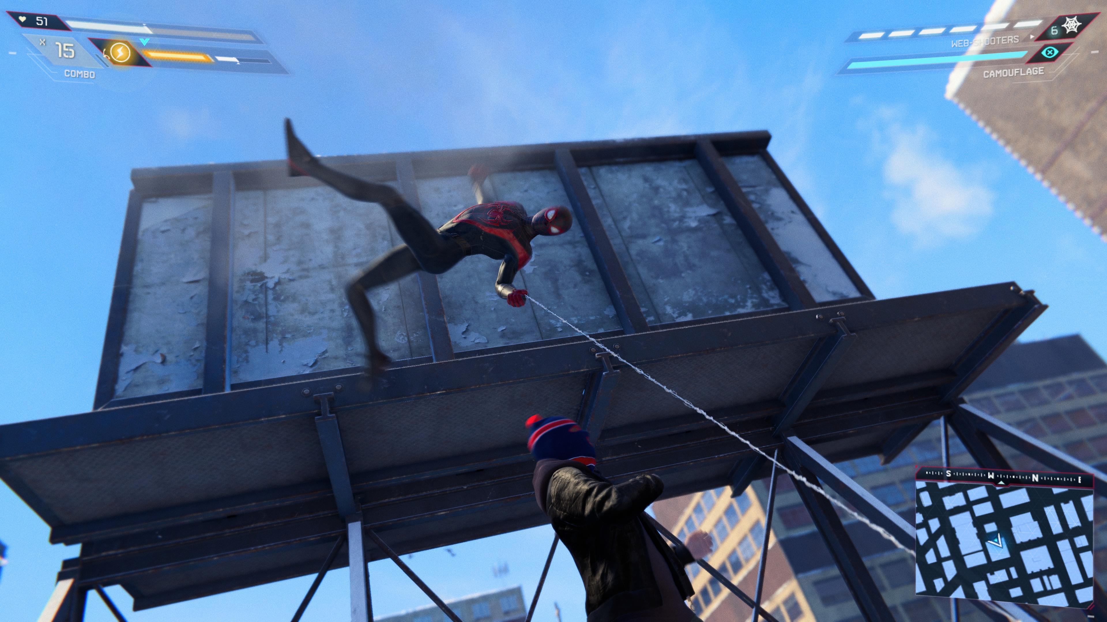 Peli nojaa myös mainiosti siihen ideaan, että Miles on vielä kokematon supersankari, sekä myös eri sukupolven edustaja kuin Peter Parker. Tämä näkyy luonnollisesti tarinassa, mutta myös pienemmissä yksityiskohdissa, kuten Milesin animaatioissa, jotka eivät ole ollenkaan niin itsevarmoja ja rutiininomaisia kuin edellisessä pelissä. Kun Miles heiluu pitkin New Yorkin taivaita raajat milloin minnekin osoittaen, pelaaja tuntee heti, että kyseessä on nuori mies, joka vielä opettelee hallitsemaan kykyjään.