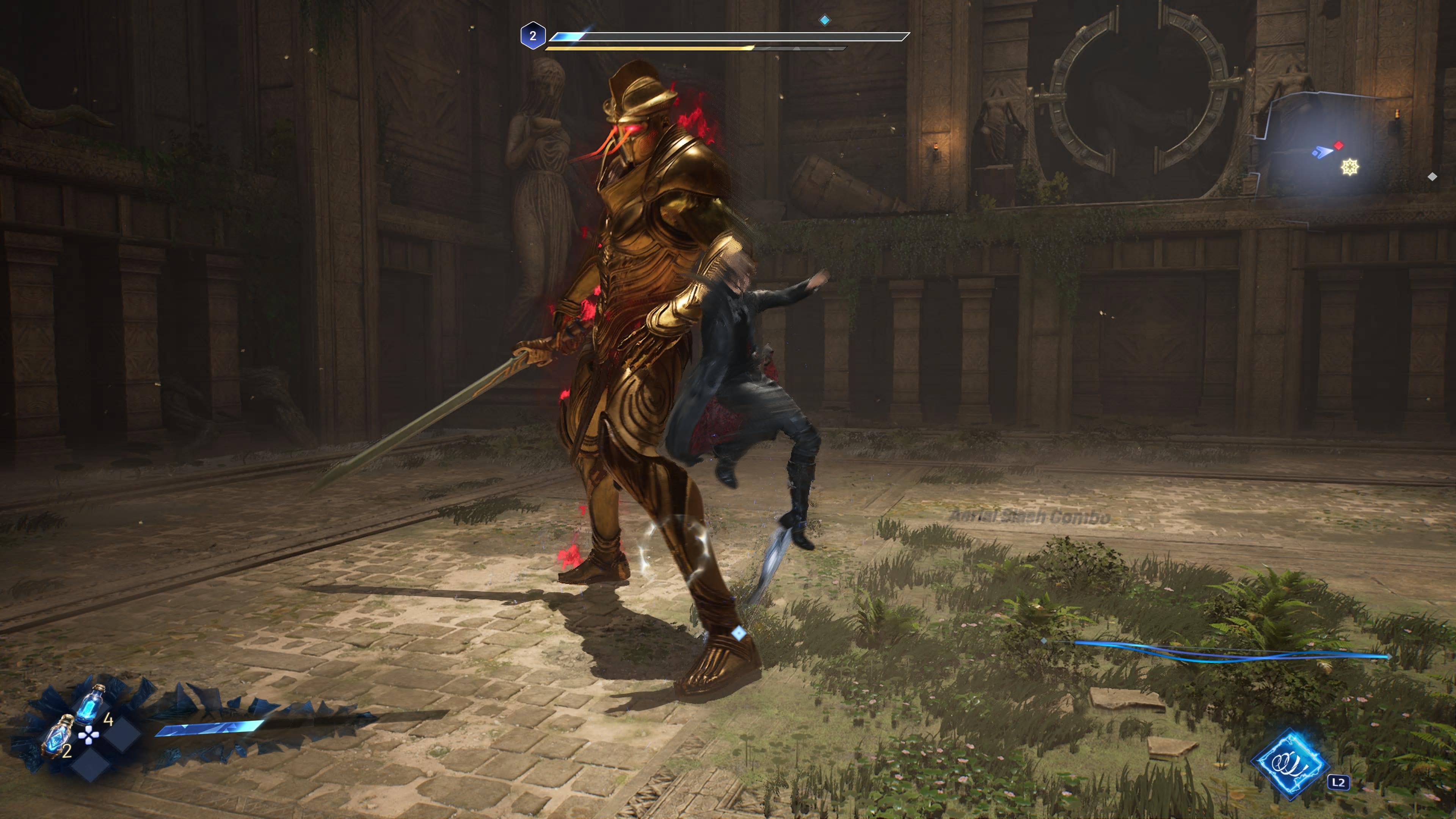 Pomovastusten lisäksi täytyy antaa onnistumismaininta taistelumekaniikoille. Ne ovat helppo oppia, mutta vaikea monipulisesti hallita - kuten kunnon pelissä kuuluukin. Erilaisia iskukombinaatioita on hyvät määrät ja ne karttuvat kokemuspisteiden kautta. Kaserin mukana viilettävä Arena tarjoaa myös aika ajoin lisävoimiaan vastustajan rauhoittamiseen. Nopeatempoisissa taisteluissa pelaajan on reagoitava nopeasti vihollisen toimiin väistöin, torjunnoin tai vastahyökkäysten muodossa. Energiamittaria saa välillä melko tarkkaan tapittaa, koska peli ajaa helposti pelaajan hyökkäyskannalle. Pelin vaikeusasteeseen ei voi vaikuttaa ensimmäisellä läpipeluukerralla lähtiessään, mutta jos peli havaitsee, ettet pärjää, tarjoaa se helpotuksia siihen soveltuvan rihkaman muodossa. Itselläni näille oli käyttöä, koska en itseäni genren veteraaniksi julistaisi. Peliä helpottaa myös suhteellisen tiuhaan tarjolla olevat tallennuspisteet, joissa parannusjuomapullot täyttyvät automaattisesti.
