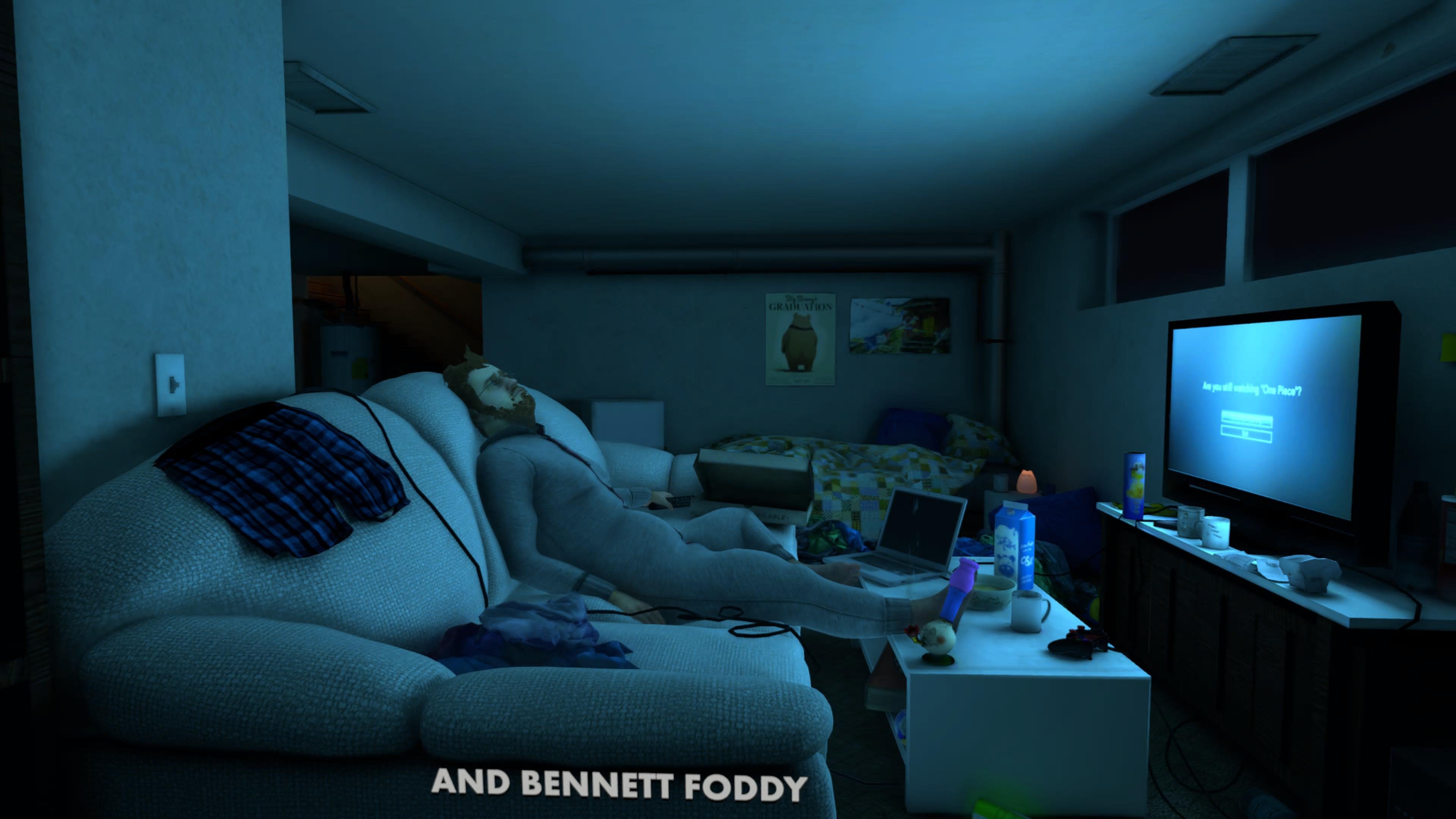 Baby Stepsin idea on hyvin yksinkertainen: eteenpäin pitäisi päästä. Pelaaja on Nate, 35-vuotias vanhempiensa kellarissa asuva nahjus, joka katsoo nuhjuisessa potkupuvussa animea. Antisosiaalinen leukapartanörtti kuvataan vastuitaan välttelevänä sohvaperunana, mutta onko taantuneinkaan miesvauva menetetty tapaus?