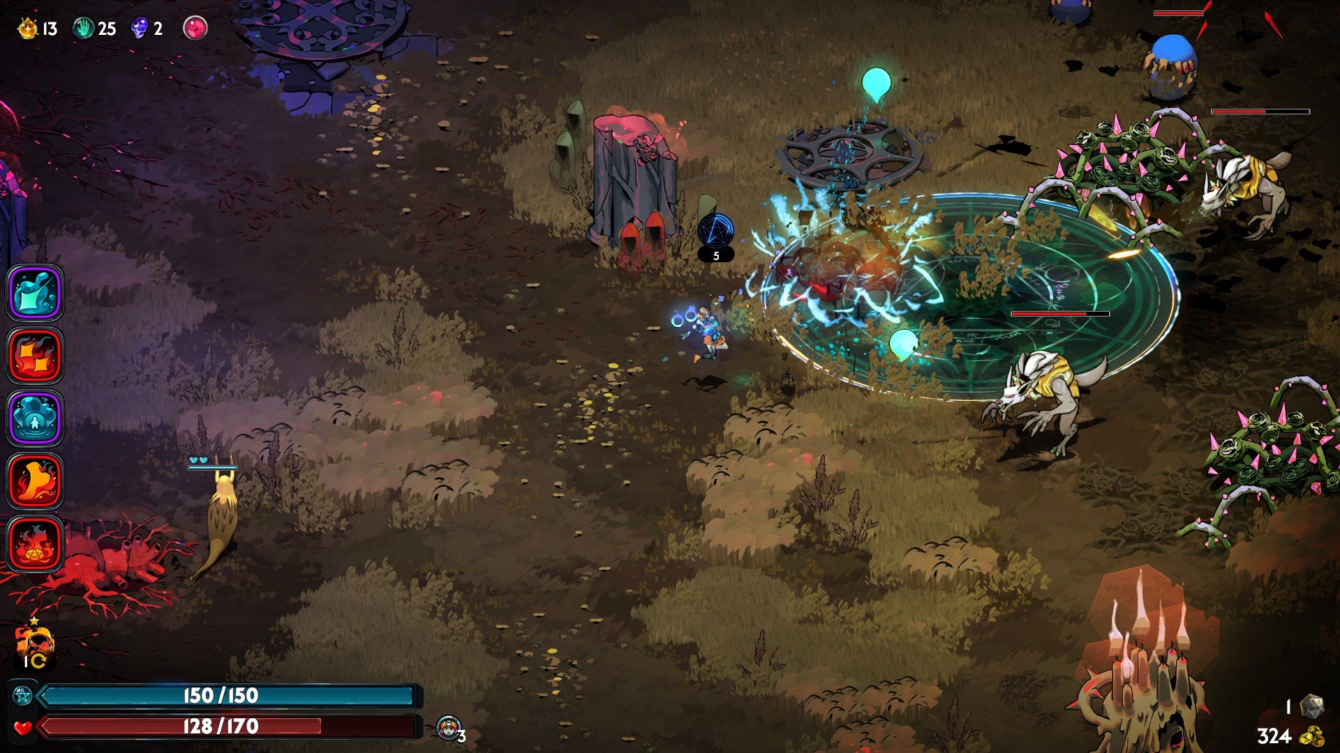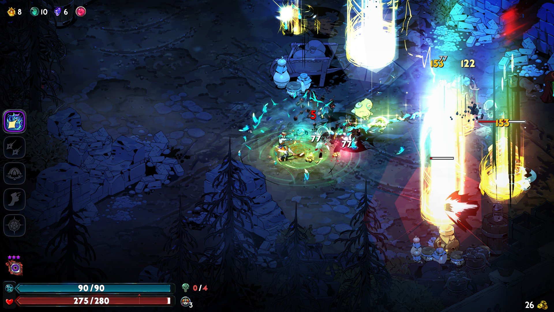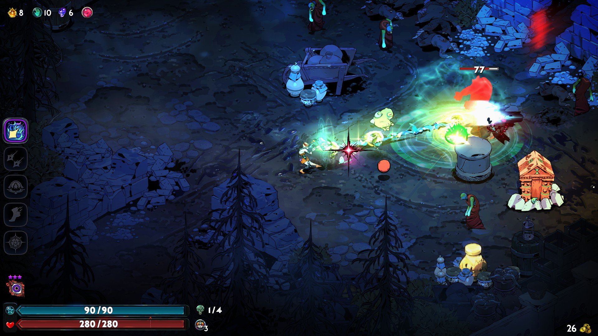 Lopputuloksena peli on myös edeltäjäänsä helpompi, sillä jos seikkailun aikana saadut erikoisvoimat sattuvat sopimaan arcana-korttien kanssa yhtään yhteen, pelaajasta muuttuu helposti koko pelikentän silmänräpäyksessä tyhjentävä terminaattori. En silti valita asiasta liiaksi, sillä tuurilla dominointi kuuluu olennaisesti roguelike-genreen. Tietysti vastaan tulee myös yrityksiä, joiden aikana kaikki menee pieleen eikä tuuri osu kohdalle. Onneksi Hadeksessa on tarpeeksi erilaisia metaprogressioita, että jokaisesta yrityksestä jää jotakin käteen: ehkäpä Kronos ei kaatunut, mutta matkan varrella löydetyillä resursseilla voi saada aikaan kaikenlaisia parannuksia tukikohtaan sekä varusteisiin.