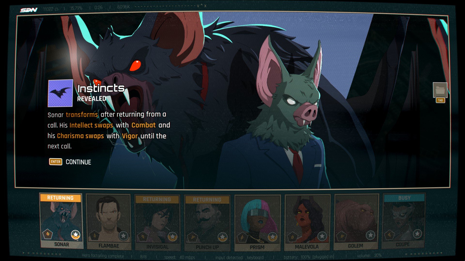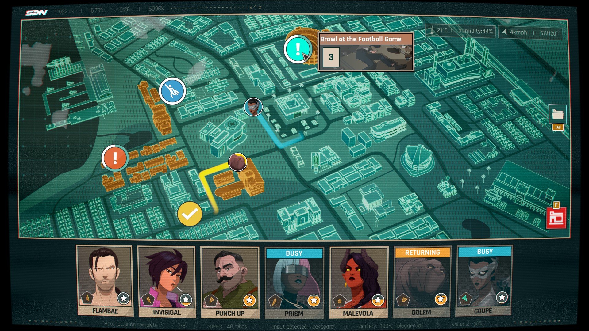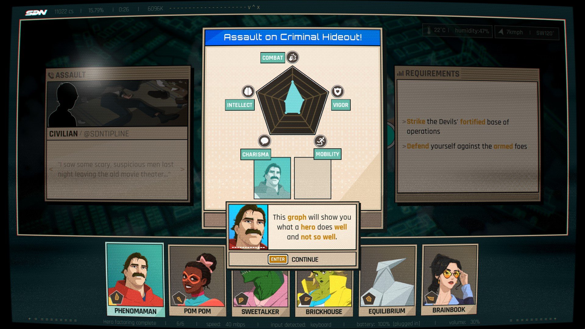 Rikostentorjunnassa täytyy ottaa tiimiläisten vahvuudet huomioon. Karismaattinen influensseri voi toimia hyvänä neuvottelijana panttivankitilanteessa, mutta hänestä ei ole yhtä paljoa hyötyä tippuvan helikopterin kanssa kuin lentävästä ja voimakkaasta liekkipojusta. Näkymätön Invisigal taas voi hiipiä helposti paikkoihin, mutta puhtaissa turpamätöissä hän ei välttämättä pärjää. Koska sankareiden täytyy myös levätä jokaisen hälytyksen jälkeen, pelaajan täytyy jatkuvasti taistella kelloa vastaan ja tasapainotella vähäisten resurssien kanssa.