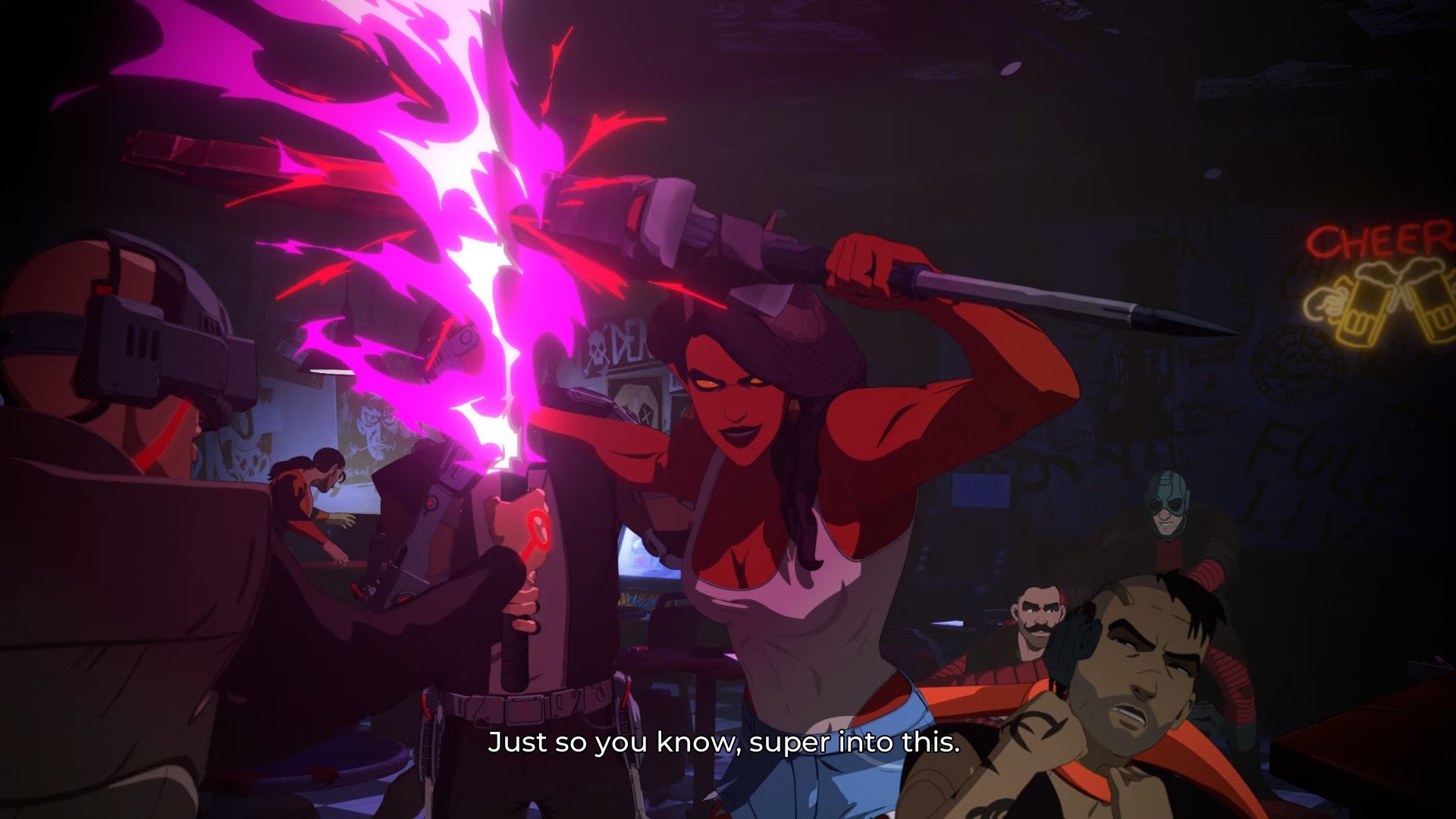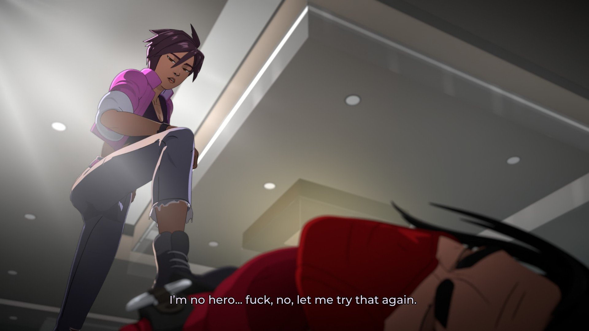 Räävittömät vitsit eivät ole ainoa syy K-18 -ikäluokitukseen. Vaikka Dispatch on ennen kaikkea komedia, väkivalta on välillä hyvin brutaalia ja veristä. Irtoraajoja lentelee, verta roiskuu ja luita murtuu tuon tuosta. Lisäksi peli on raikkaan sinut seksuaalisuutensa kanssa: vaikka nettipuheiden perusteella odotin enemmänkin lakanoiden heilutusta, pelistä löytyy rehellistä alastomuutta, seksikohtaus sekä yleistä seksuaalista jännitettä. Dispatch myös ymmärtää miten seksi toimii osana tarinankerrontaa: graafisuudesta ja leikittelevyydestä huolimatta seksuaalisuus ei tunnu tirkistelevältä tai halvalta, vaan se on osa aikuisista kertovaa tarinaa. Hahmot ovat myös niin anteeksipyytelemättömän seksikkäitä, että pelaajallakin alkavat sukat pyöriä jaloissa. Nämä trikoosankarit eivät siis ole perheen pienimmille.