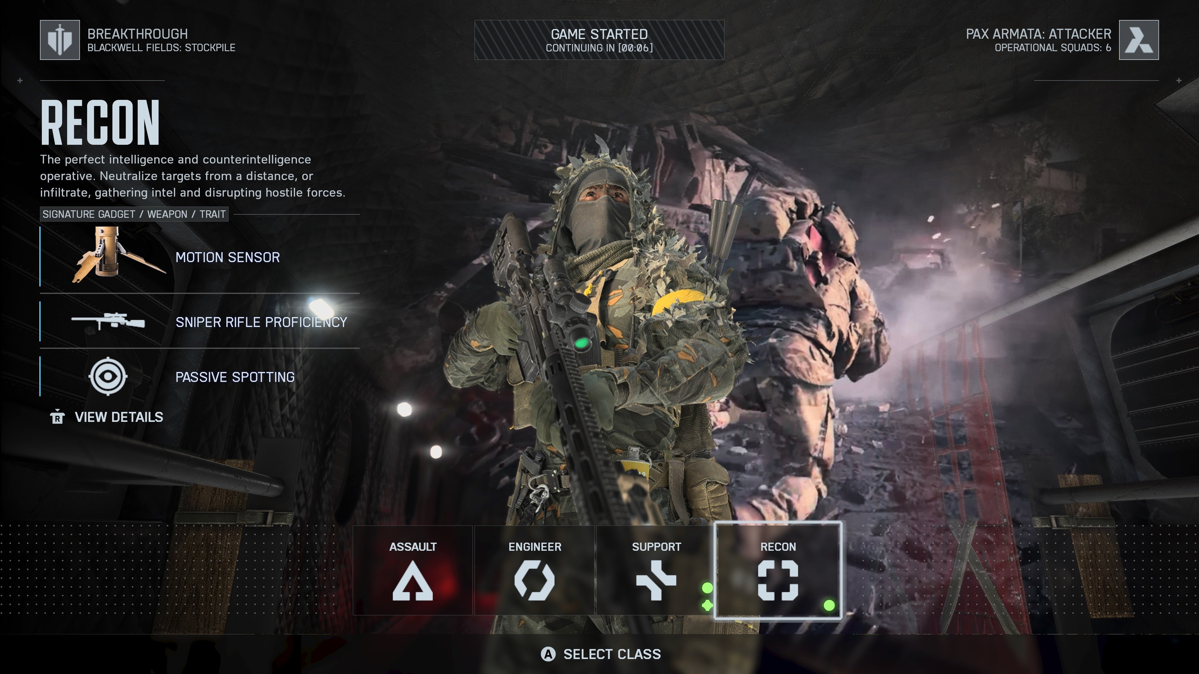 Sotilaat on jaettu neljään luokkaan; rynnäkkösotilas, insinööri, huoltaja ja tiedustelija. Aseistuksen hahmoluokille saa vapaasti valita avoinna olevista vaihtoehdoista (esim. tarkkuuskivääri rynnäkköhyökkääjälle), mutta erityiskyvyt ja asustukset ovat sidottu luokituksiin. Siinä missä tiedustelija pystyy dronella havainnoimaan ympäristöstä vihollisia, voi insinööri korjata taistelussa osumaa ottaneen panssarivaunun. Kyvyt ovat hyödyllisiä ja tasapaino on onnistuttu säilyttämään hyvin.