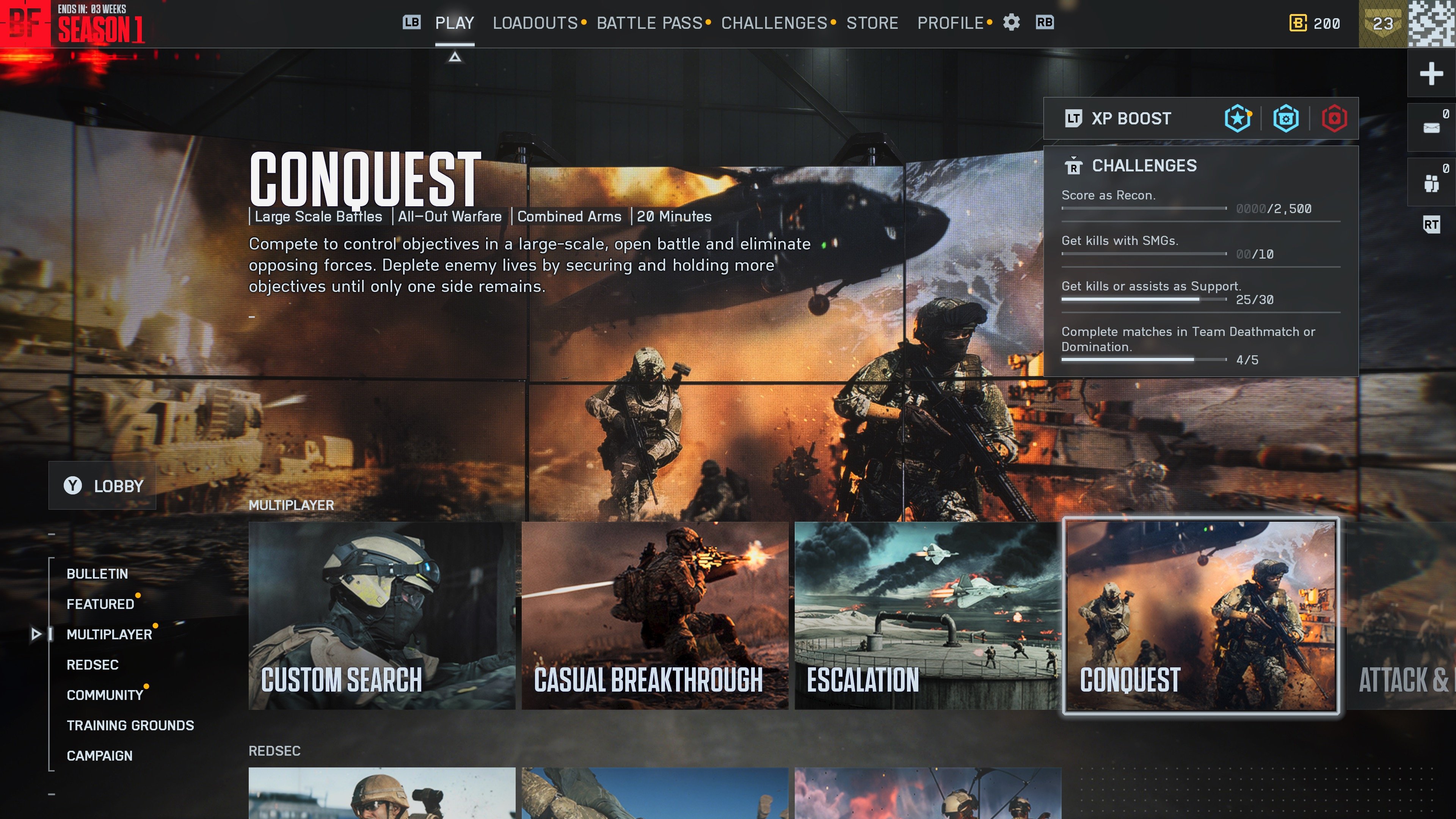 Massiivisimmista pelimuodoista Breakthrough nousi omaksi suosikikseni. Toinen joukkue hyökkää toisen puolustaessa merkittyjä alueita. Kun hyökkääjä saa alueet valtaansa, alue laajenee seuraaville kohteille tehden toiminnasta vähemmän kaoottisen puolelle lipuvaa, pelaajamäärän kuitenkin pysyen Conquestin tasolla. Lisäksi isommalle pelaajamäärällä pääsee pelaamaan Escalationia, joka on muunnelma Conquestista. Joukkue saa pisteitä hallittuaan tarpeeksi pitkään enemmistöä kohdealueista ja pisteiden jaon yhteydessä pisteen keränneen joukkueen spawn-pistettä lähin kohde poistetaan pelikartalta tiivistäen taistelua. Rush taas on Breakthroughin kaltainen muoto pienemmällä pelaajamäärällä. Hyökkääjät pyrkivät tuhoamaan vastapuolen M-COM-viestintätukiasemia virittäen pommeja puolustajien pyrkiessä estää tämä.