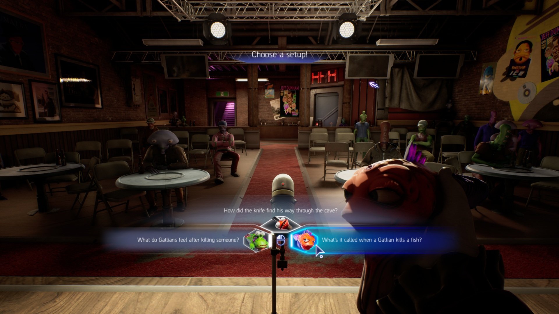Vaikka toiminta on entistä isommassa osassa, aloitetaan siitä tärkeimmästä, eli komediasta. Suuri osa High on Lifen vitseistä liittyi pelin surrealistiseen maailmaan: visuaalisesti vahamaiselta vaikuttavassa maailmassa ihmiskuntaa impattiin bongilla, pelaajan aseet olivat puhuvia alienpyssyjä ja jokainen vastaantulija oli jonkinlainen surrealistinen vitsi, kuten 30-luvun mafiaelokuvien lailla puhuva kätyri, tai halinallea muistuttava sihteeri. Eriskummallisuuteen nojaavassa huumorissa on se huono puoli, että kierroksia pitäisi lisätä jatkuvasti, mutta High on Life 2 ei pistä edes vakkaria silmään, vaan painaa pehmeästi jarrua. Uuden tarinan aikana kohdatut kummajaiset ovat entistä laimeampia, vitsit ennalta-arvattavampia ja satiiri säyseämpää. Maailmasta on kadonnut uutuudenviehätys ja ihmetys; tilalla on vain samaa tavanomaisuutta ja harmautta, josta sankarihahmo kärsii pelin alussa.