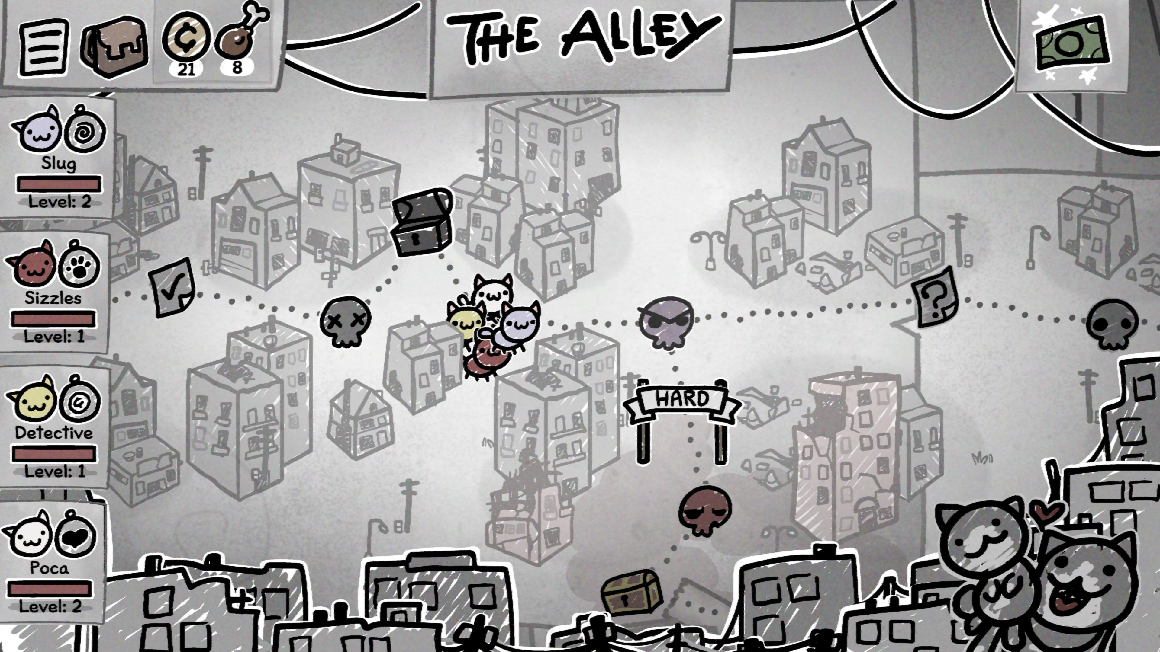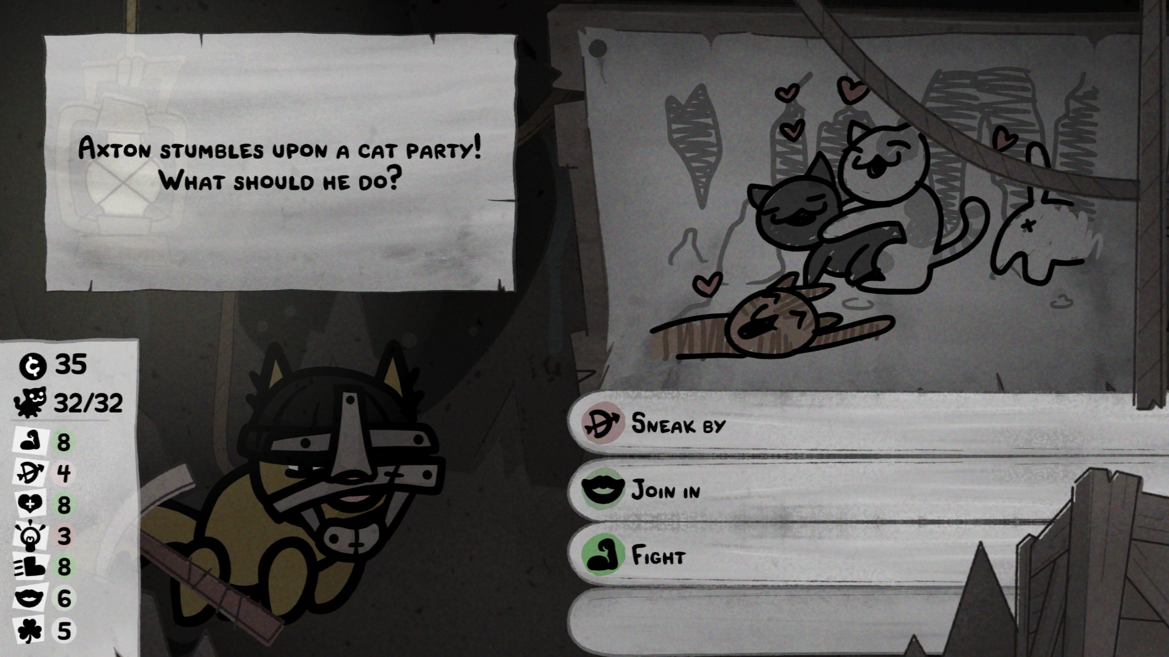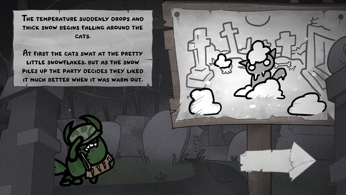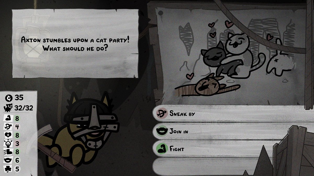 Tämä onkin pelin ensimmäinen ongelma. Kaikki kyvyt eivät suinkaan ole tasapainossa keskenään, eikä peli tunnu huolehtivan mitenkään siitä, että kissojen aloitussetit tarjoavat jonkinlaisen alun kohti koherenttia ja toimivaa konseptia. Samalla niskassa on kuitenkin valtava paine, sillä pelin vaikeustaso nousee seikkailun aikana nopeasti ja dramaattisesti, joten jos ei onnistu kasaamaan ainakin parille kissalleen todella toimivaa kokonaisuutta, edessä on väistämättä epäonnistuminen.