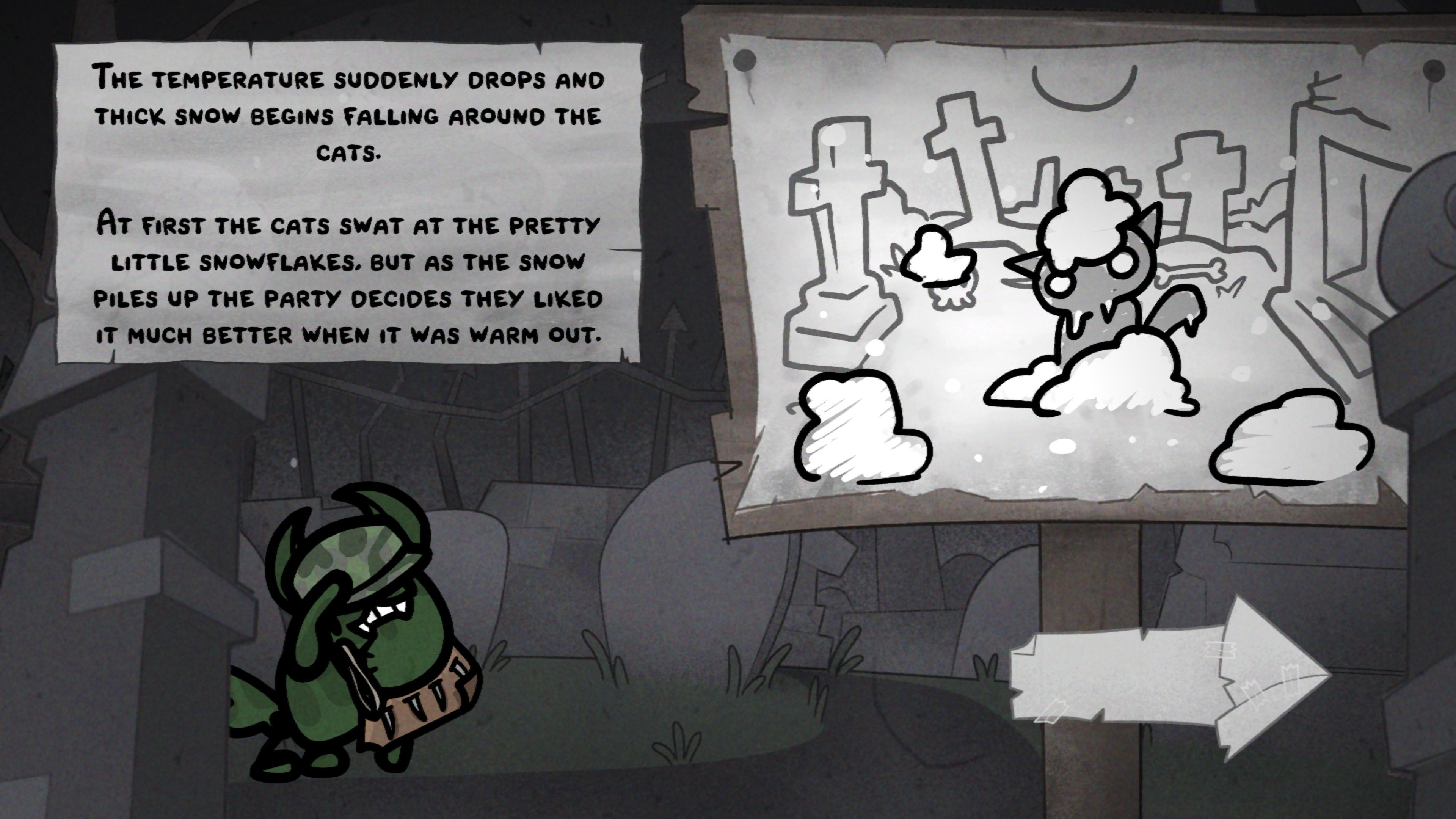Itse seikkailut ovat lineaarisia karttoja, joissa edetään satunnaisesta tapahtumasta taisteluun ja muihin skriptattuihin tapahtumiin. Tapahtumissa joku neljästä kissasta kohtaa jotain yllättävää, johon pelaajan pitää sitten reagoida kissojen ominaisuuksiin sidotuilla vaihtoehdoilla. On täysin mahdollista, että satunnaisuus heittää kissan sellaiseen tapahtumaan, jossa tämä ei ominaisuuksiensa puolesta voi tehdä muuta kuin kävellä pois, koska todennäköisyydet hyvälle lopputulokselle ovat niin astronomisen pienet.