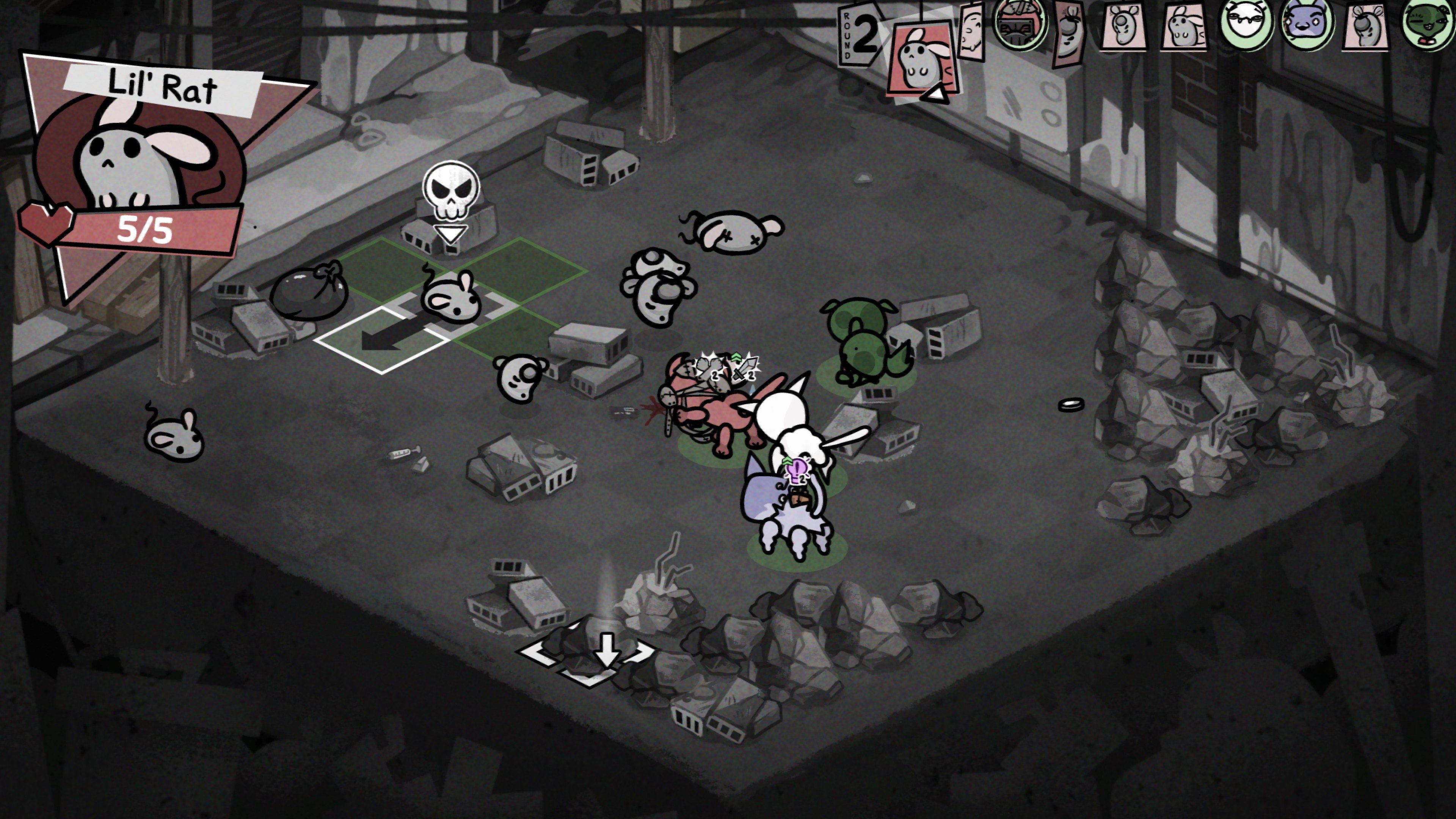 Mainitsin jo, miten taistelut tuntuvat usein puzzleilta, jotka ovat joko mahdottoman vaikeita, tai älyttömän helppoja. Tämä on erityisen totta pomotaisteluissa, jotka tuntuvat aluksi aivan täydeltä hevonjöötiltä. Ensimmäinen minipomo on rotta, joka jatkuvalla syötöllä heittelee taistelukentälle Bomberman-henkisiä pommeja, aiheuttaen massiivista vahinkoa nopeammin kuin pelaaja ehtii parantaa. Mutta sitten huomaamme, että pommeja ei tarvitse välttää, koska ne voi myös rikkoa yhdellä iskulla. Hetken päästä huomaamme todennäköisesti myös, että rikkinäinen pommikin voi vielä laueta, jos sen ruutu esimerkiksi syttyy palamaan, mikä on hauska yllätys. Tai jos sattuu kohtaamaan tämän pomon vesisateen aikana, pommien sytytyslangat sammuvat saman tien, eivätkä ne ikinä räjähdä… ellei salama satu iskemään pommin ruutuun.