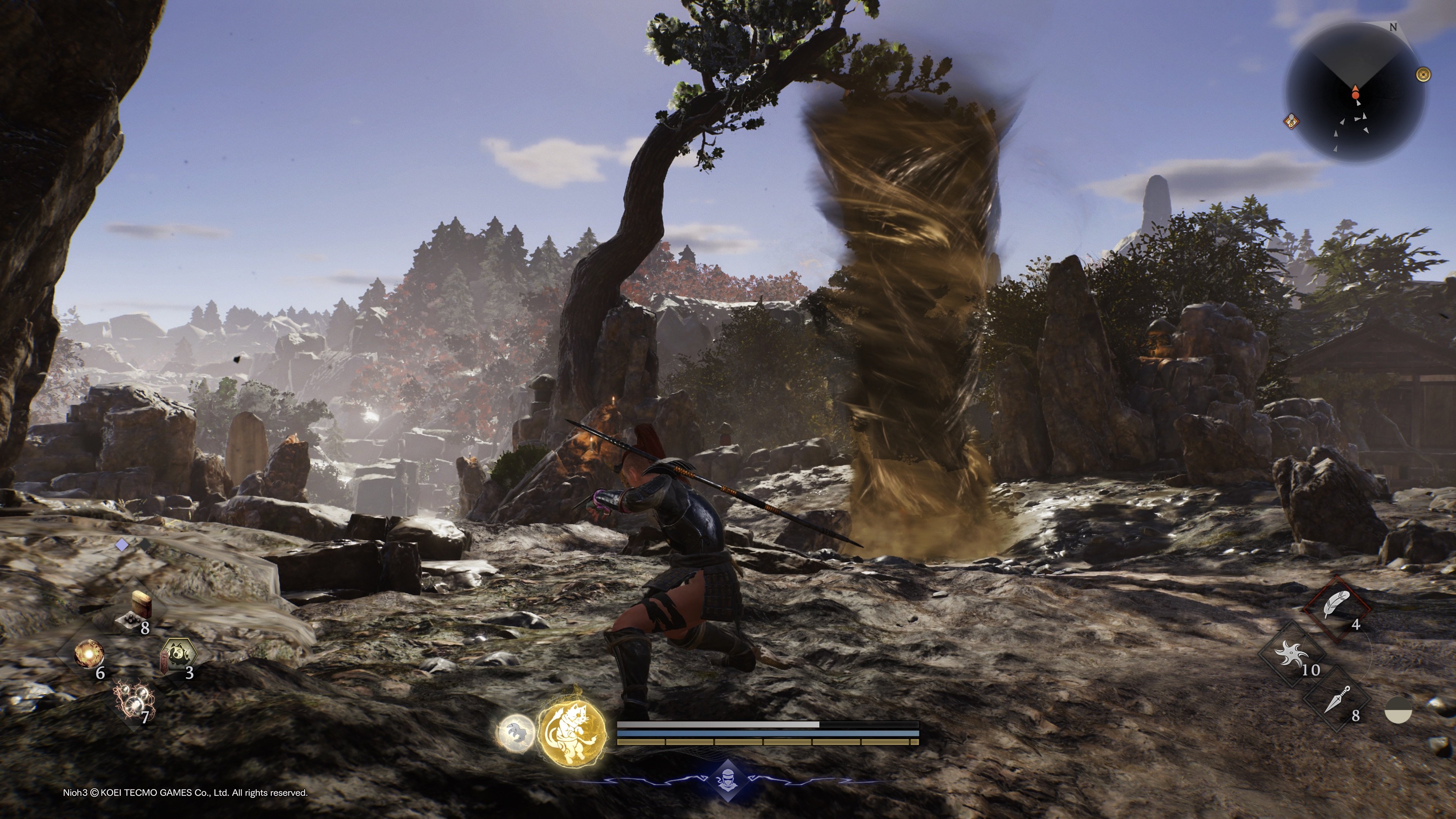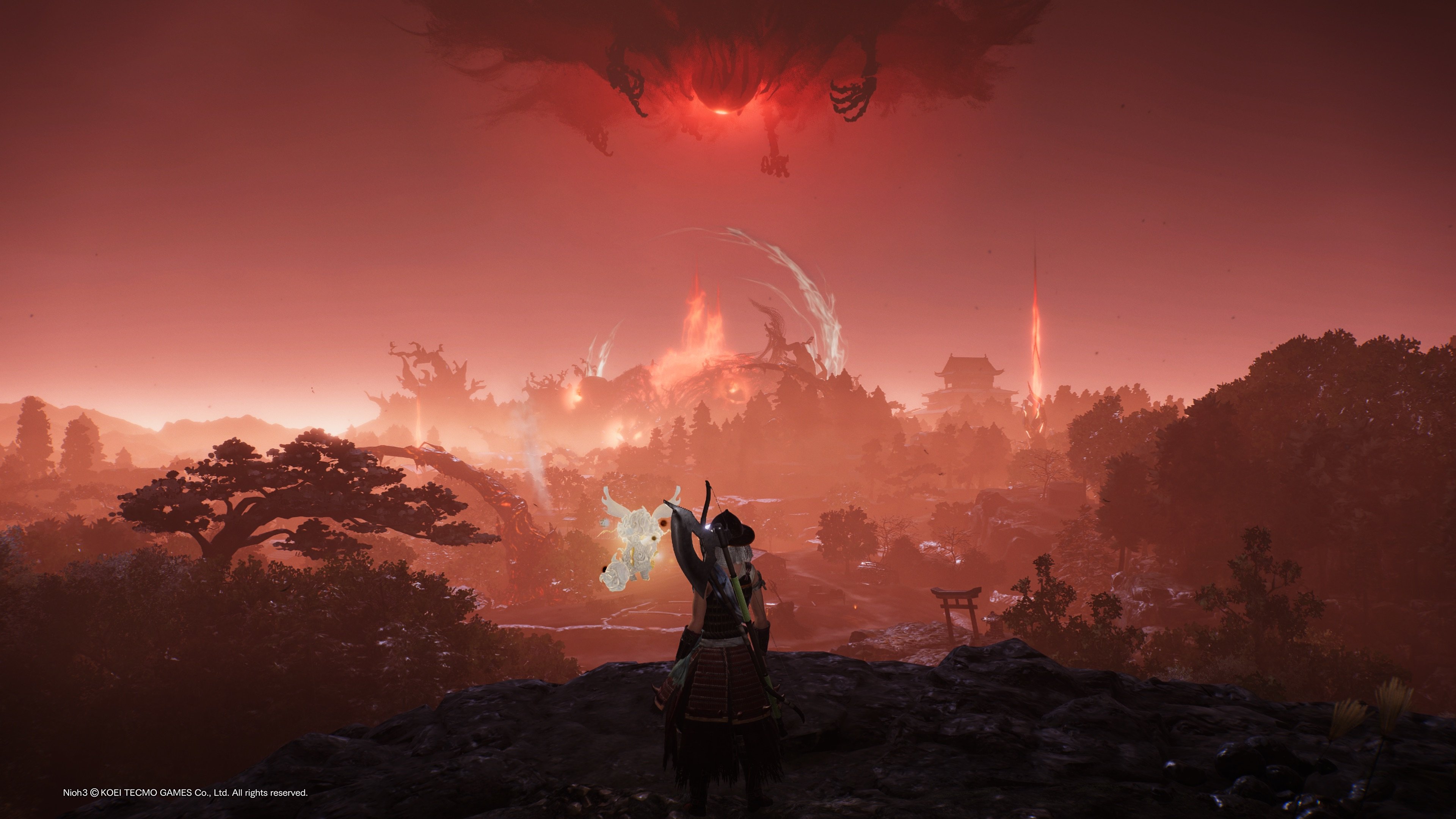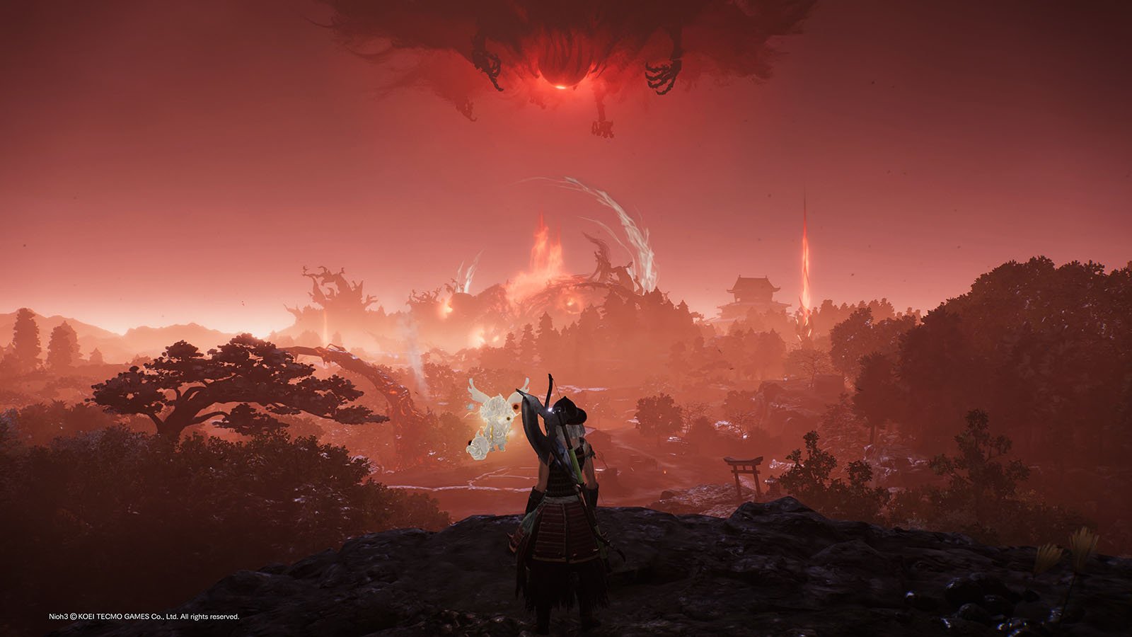 Se suurin rakenteellinen ero sarjan aiempiin peleihin on taas selvästi Elden Ringin perintöä. Team Ninja, monen muun kehittäjän tavoin, on katsonut Namcon jättimenestystä ja sen avointa pelimaailmaa haikaillen ja päättänyt sitten tehdä siitä oman versionsa. Siinä missä aiemmat sarjan pelit sijoittuvat itsenäisille ja erillisille alueille, joiden välillä liikuttiin karttaruudun kautta, Nioh 3 on avoimen maailman peli. Vaikka tarinan aikana tulee pari siirtymää, enimmäkseen tarjolla on hyvin suuri ja yhtenäinen pelimaailma, jossa voi seikkailla mielensä mukaan. Peli kyllä heittää koko ajan eteen tarinaa kuljettavia tavoitteita, mutta mikään ei estä lähtemästä niiden sijaan jonnekin aivan muualle keräämään kokemuspisteitä, jahtaamaan sivupomoja ja etsimään parempaa loottia.
