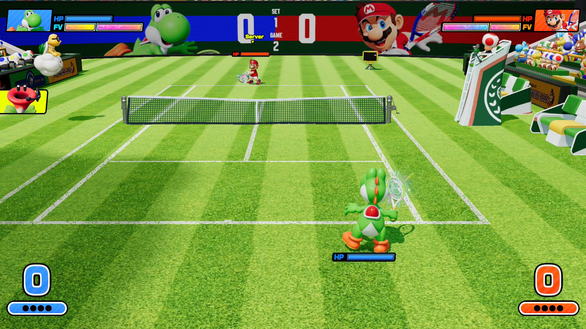 Mario Tennis Feverin tenniskontrollit muistuttavat tietyiltä osin lievästi Virtua Tenniksen aikanaan lanseeraamia ja vieläkin voittamattomia sellaisia, mikä on hyvä asia. Vähän turhaa niiden kaikkien opettelusta kuitenkin tekevät Fever-erikoisvoimat. Ymmärrän, että kyse on Mario-pelistä, joten näitä pitää olla mukana, mutta ne vievät vahvasti makua tenniksen perusosaamisesta, jonka treenaamiseen juuri käytettiin kaksi tuntia. Usein päädyinkin vain palauttelemaan palloa kärsivällisesti, kunnes superlyönti tuli käytettäväksi ja se koitui lähes aina vastustajan kohtaloksi. Jos ei ole pakko pitää taukoja, seikkailutilan läpäisee muutamassa illassa (tehokkaimmillaan kolmessa tunnissa), joten ihan sillä ei pelin hintalappua kateta.