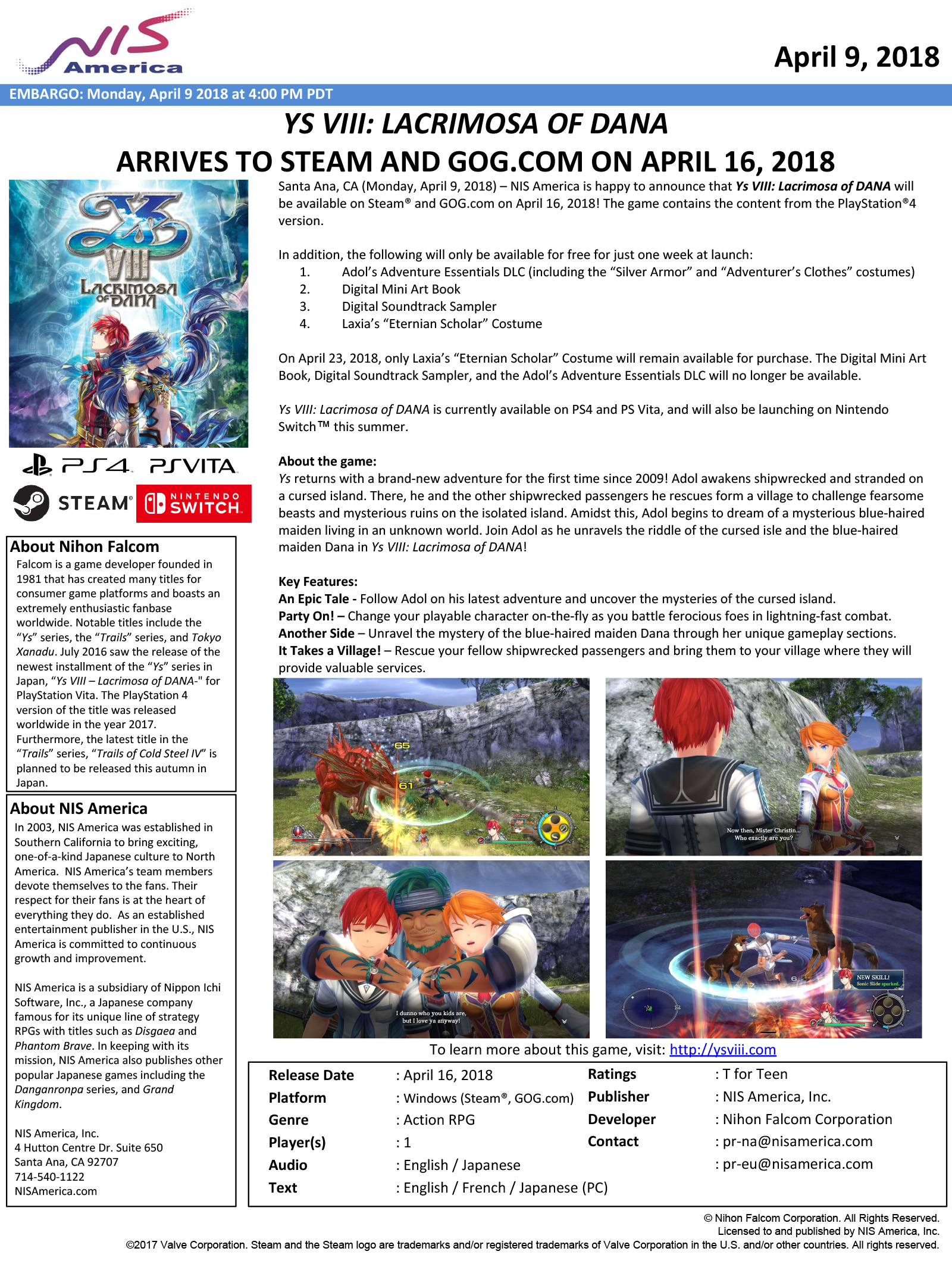 NIS America on paljastanut JRPG-teoksensa saapuvan Steamiin huhtikuun 16. päivä. Luvassa on kaikki PS4-versiossa nähty sisältö, minkä lisäksi ripeät ostajat saavat kaupan päälle Adol's Adventure Essentials -laajennuksen, taidekirjasen, soundtrackin sekä vaatekerraston. Kaikki paitsi viimeisenä mainittu Laxia's Eternian Scholar -puku poistuvat kaupasta ikiajoiksi ensimmäisen viikon jälkeen (23.4.).