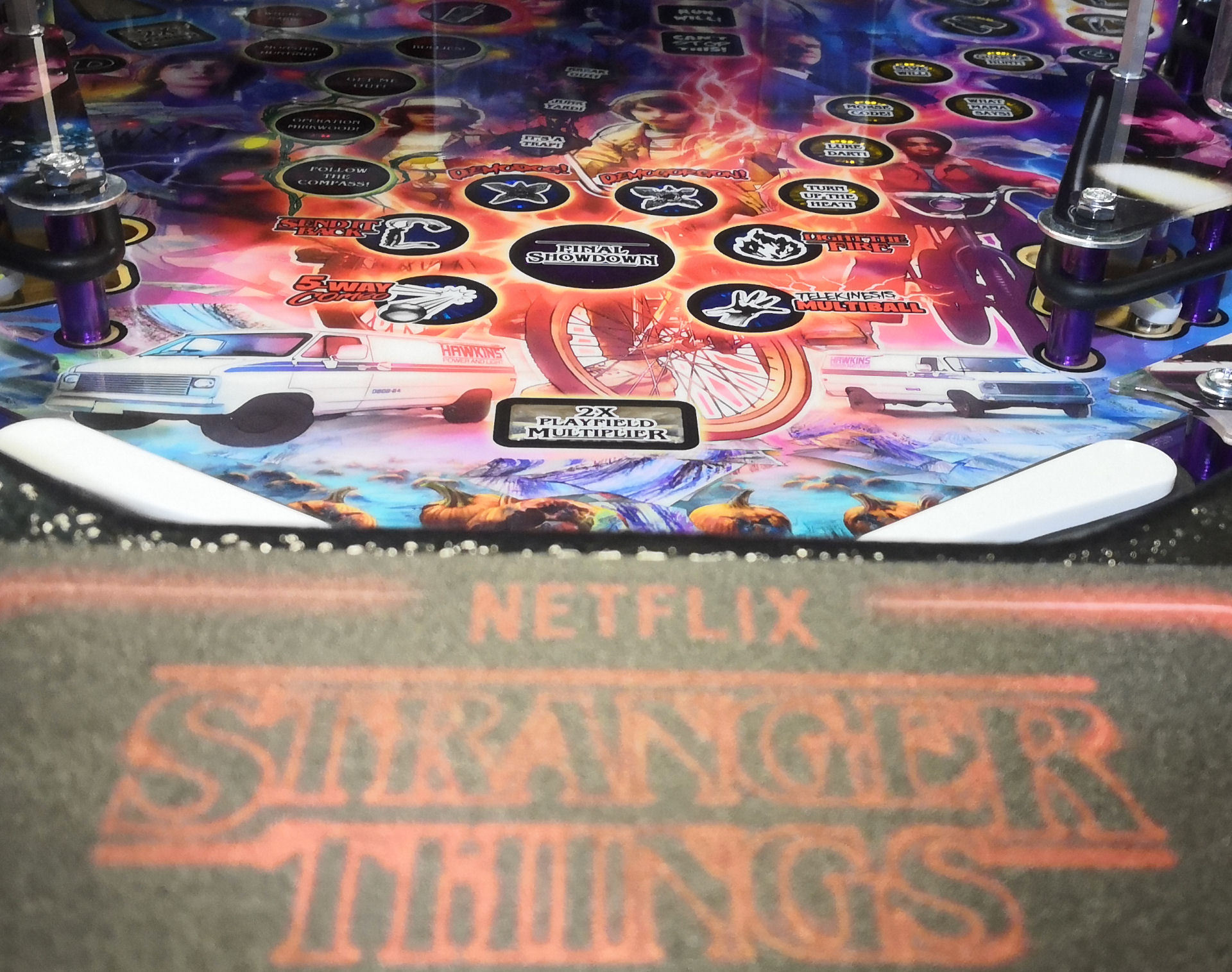 Stranger Things on täyttä asiaa. Brian Eddy, joka on suunnitellut kuuluisat "Medieval Madness" ja Attack from Mars" flipperit, on myös Stranger Thingsin pääsuunnittelija. Koneissa on käytetty toimintovaloina väriä vaihtavia ledejä, joten näyttävyys ja näkyvyys on kohdallaan. Kaikissa malleissa myös kentän yleisvalaistus on totetutettu moniväriledeillä oikean tunnelman luomiseksi. Tässä koneessa on käytössä Sternin uusi "SPIKE 2" ohjausjärjestelmä, joka perustuu CAN-BUS tekniikkaan.
