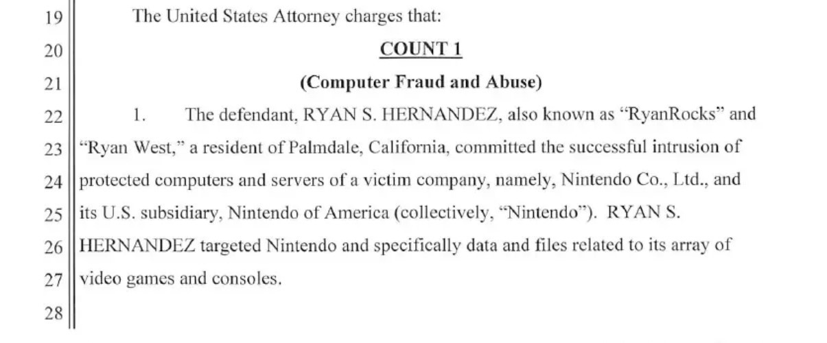 21-vuotias Ryan Hernandez tuomittiin kolmen vuoden vankilaistuntoon murtautumisesta Nintendon palvelimille ja sisäisten tietojen levittämisestä sekä yli tuhannen lapsipornoa sisältävän tiedoston hallussapidosta. Hernandez tunnusti syyllisyytensä jo tammikuussa. Ensimmäisen kerran FBI sai miehen kiinni vuonna 2017, mutta hän pääsi alaikäisenä pälkähästä lupaamalla lopettavansa hakkeroinnin. Eipä lopettanut.