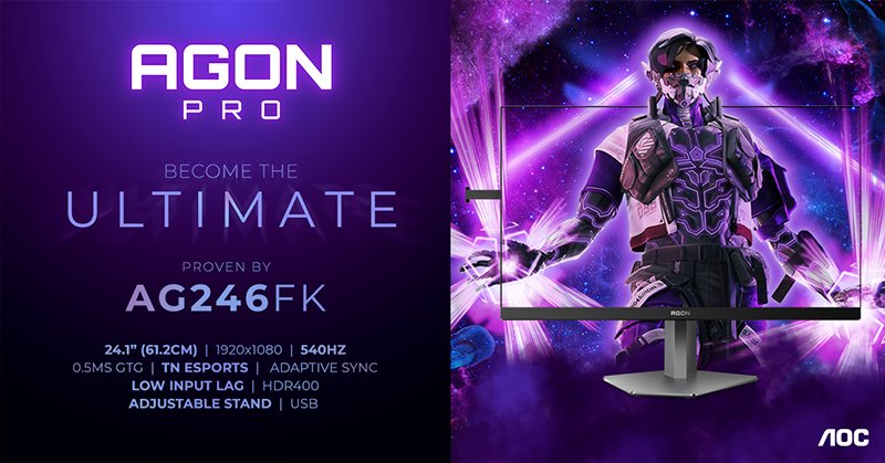 AOC:n uusimmat näytöt ovat 540 Hz (!) 24,1-tuumainen AG246FK Ultra-Fast TN-paneelilla ja 24,5-tuumainen 390 Hz AG256FS Fast IPS -paneelilla. AG246FK:ssä on kattava väriasteikko 99,6 %:n sRGB- ja 94,7 %:n DCI-P3-kattavuudella sekä DisplayHDR 400 -sertifikaatti, AG256FS:ssä 99,1 %:n sRGB-kattavuus ja DisplayHDR 400. Hinnat ovat 699 eur ja 449 eur.