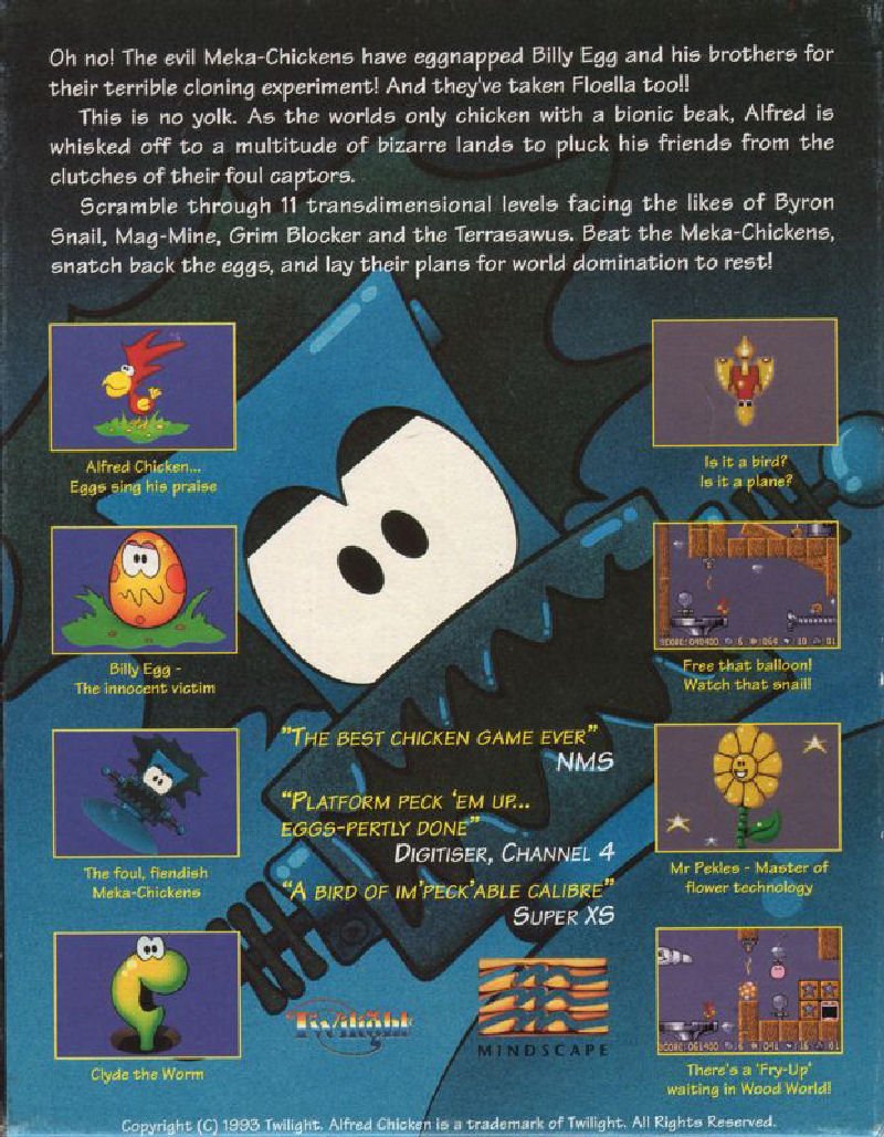 Alfred Chicken oli aikoinaan vallan veikeä tasoloikiskelu. Päähenkilö Alfred oli hölmistyneen oloinen kana, joka joutui melkoiseen tasoloikkasoppaan. Ihanan höperö ja vähän sekopäinenkin peli oli pohjimmiltaan aika tyypillistä platformailua, mutta jotain mainiota ja virkistävää siinä vain oli. Ja siksi se on jäänyt meikäläisenkin mieleen yllättävän kirkkaasti.