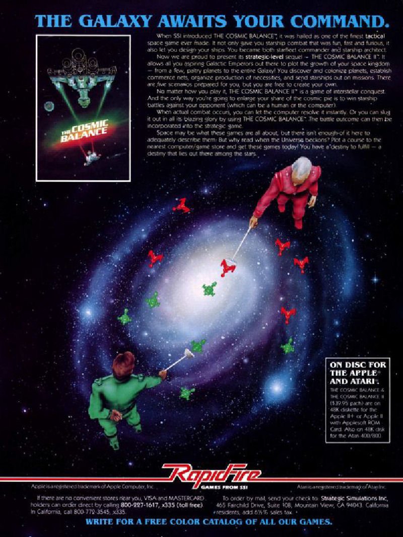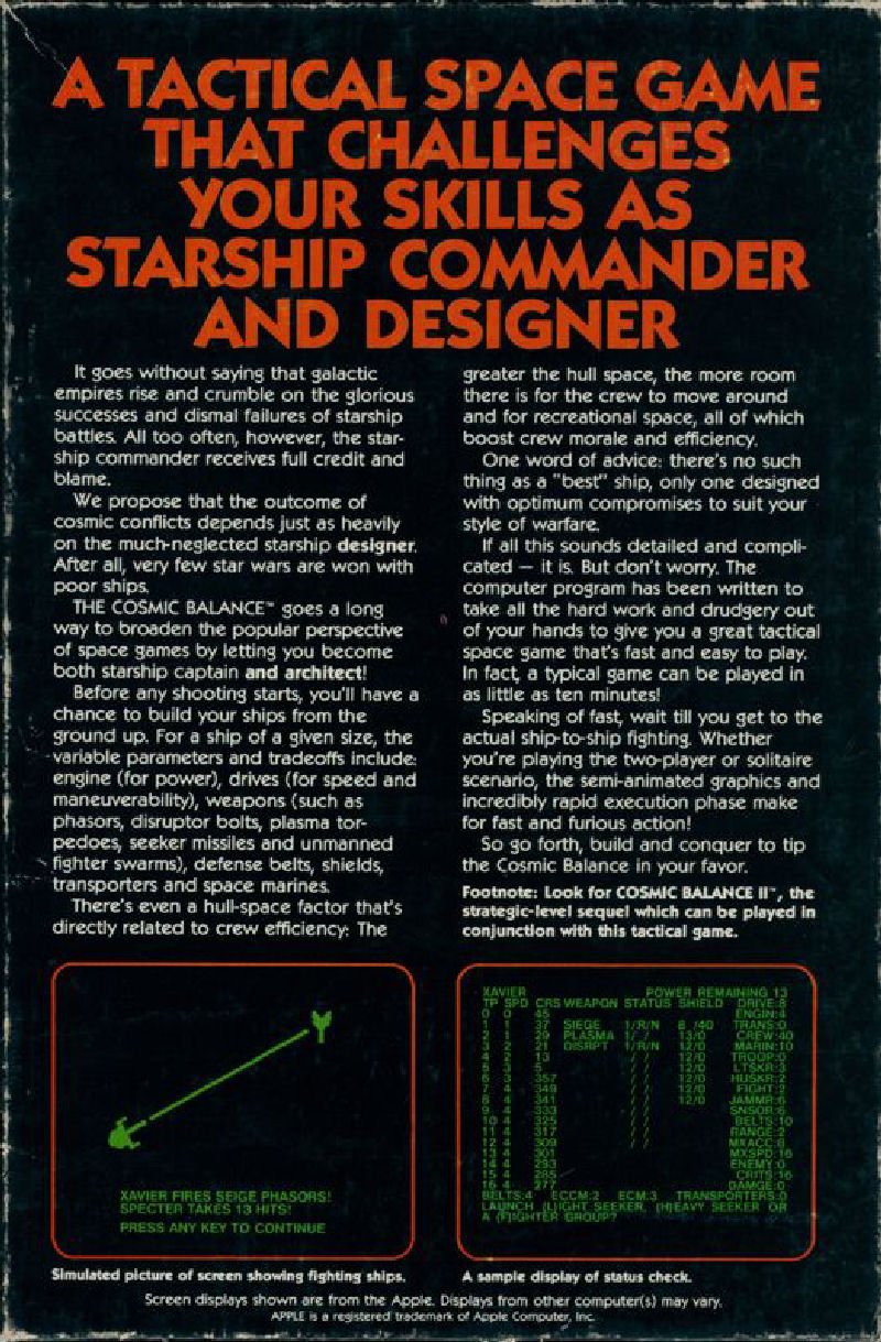 Muinainen avaruusstrategiapeli Cosmic Balance puhkuu silleen riittävästi Star Trekiä, vaikka ei sitä suoranaisesti olekaan. Ensimmäisen skenaarion alukset ovat vain ihan sattumalta Starfleetin aluksia, Enterprise ja Reliant. Mutta on peli paljon muutakin: se on vuoropohjaista komentelua ja reaaliaikaista toteutusta yhdistävä avaruustaistelusimulaatio, jossa on myös erittäin laaja aluseditori. Pelaajat voivat luoda ja/tai muokata mieluisia avaruusaluksiaan viidessä eri kokoluokassa korvetista taisteluristeilijään, ja varustaa niitä aivan mielensä mukaisesti. Ehkä isompaan taisteluun voisi rakentaa vaikkapa oman Galactican, jota tukee ryhmä kevyempiä aluksia?