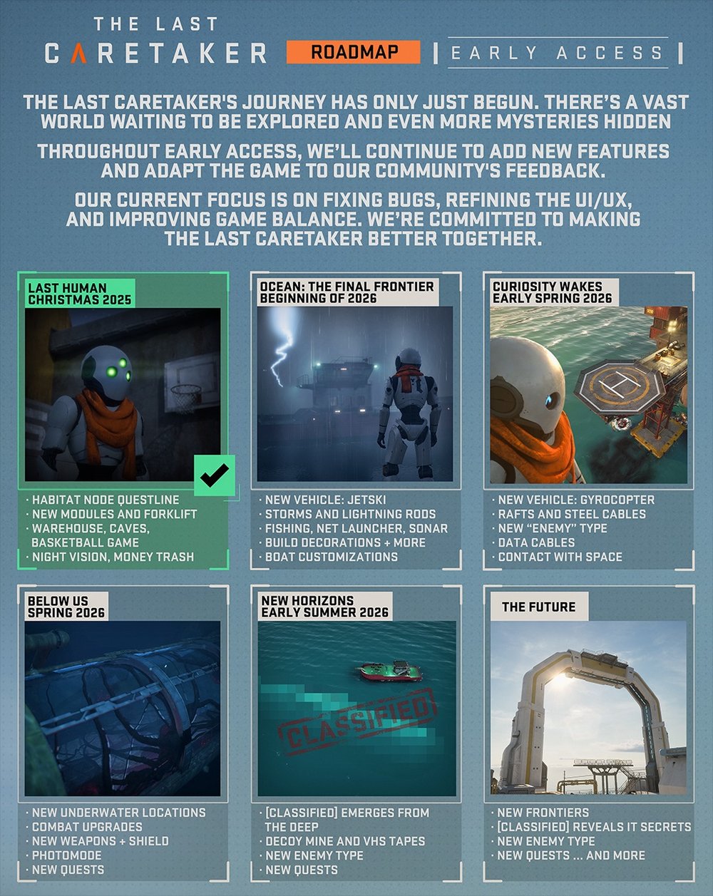 Last Humans ei ole ainoa lähiaikojen päivitys: jos pelille suunniteltu roadmap pysyy aikataulussa, ennen ensi kesää olisi tiedossa vielä neljä merkittävää päivitystä, jotka toisivat mukanaan muun muassa myrskysäitä, kalastusta, koptereilla lentelyä, uusia vihollisia sekä maanalaisia yllätyksiä.