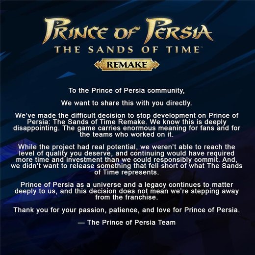 Lisätietoja ei ole juuri annettu, joten tällä hetkellä ei tiedetä, mitä Prince of Persiaan liittyvää on seuraavaksi ilmestymässä, tai miksi The Sands of Timen remaken kehitystyö meni puihin. IGN muistaa kertoa, että myös vuoden 2024 reboot Prince of Persia: The Lost Crown floppasi (joskin V2.fi:n Miikka ylisti peliä suurestikin), ja sitä kehittänyt tiimi pistettiin palasiksi. Tänä syksynä ilmestyi pelisarjan viimeisin osa Rogue Prince of Persia, jota V2.fi:n Miikka kehui erinomaiseksi.