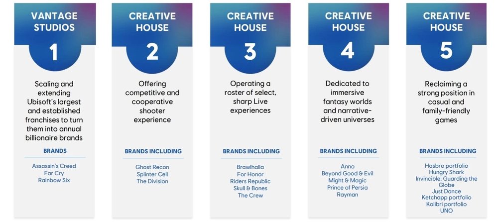 Koko Ubisoftin rakenne uudistetaan: huhtikuusta alkaen Ubisoftin sisällä on viidestä Creative Housesta koostuva rakenne, jonka viisi "taloa" keskittyy avoimen maailman seikkailuihin sekä games-as-service-native -mallin kokemuksiin. Creative House -rakenteen taustalla toimii tukijoukkoina myös tuotantokapasiteetissa avustava Creative Network sekä tuotannossa, teknologiassa ja bisnespäätöksissä auttava Core Services. Jokaisen Creative Housen alla on jatkossa lukuisia pelistudioita, jotka toimivat eri pelisarjojen parissa. Lisäksi jokainen Creative House on vastuussa pelinteon kaikista vaiheesta alusta loppuun, on kyseessä sitten kehitystyö, rahoitus, markkinointi tai brändityö. Uuden rakenteen uskotaan muun muassa selkeyttävän vastuualueita sekä nopeuttavan päätöksentekoa.