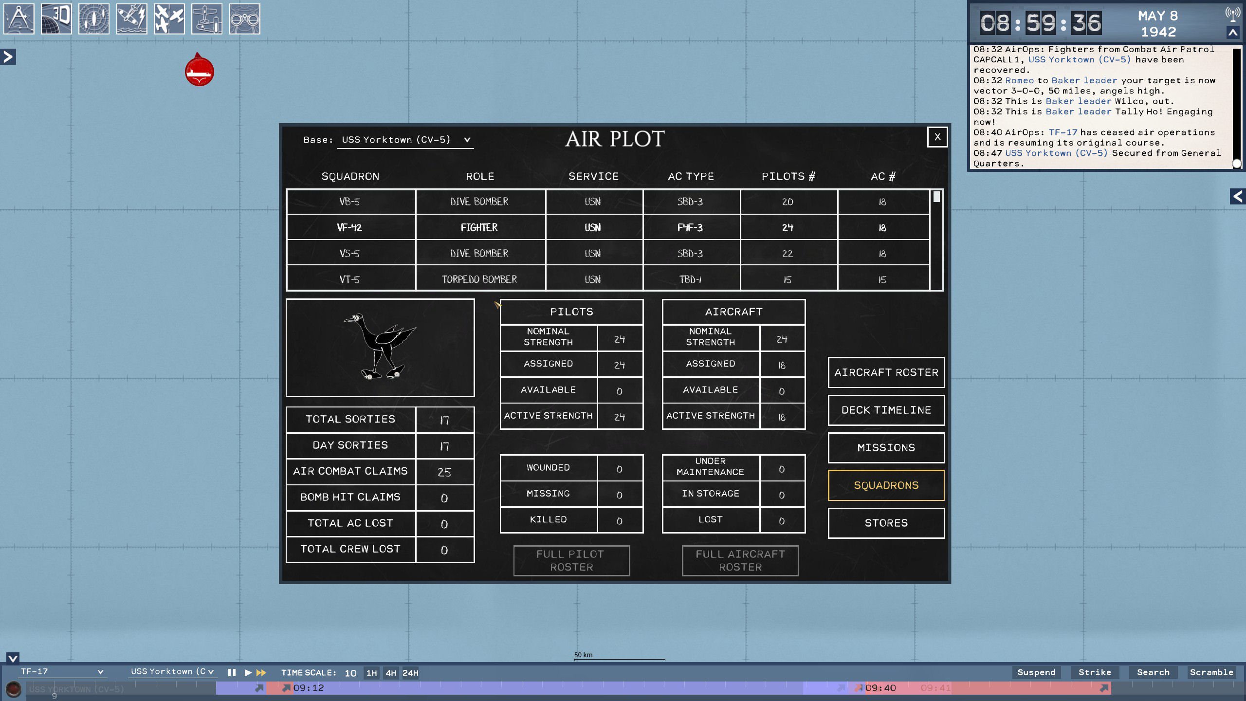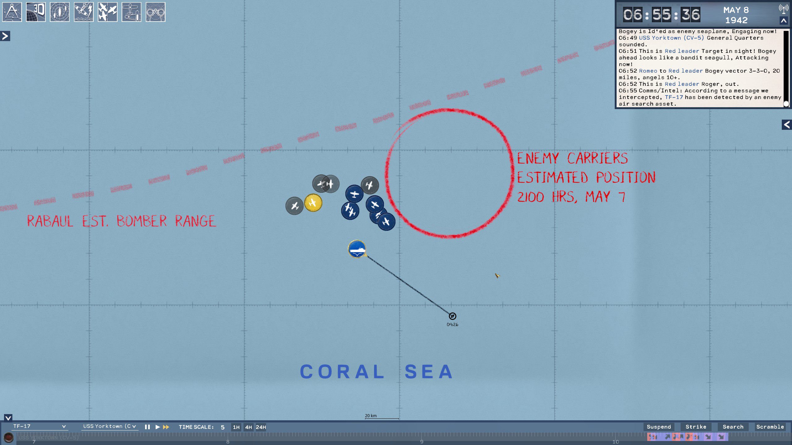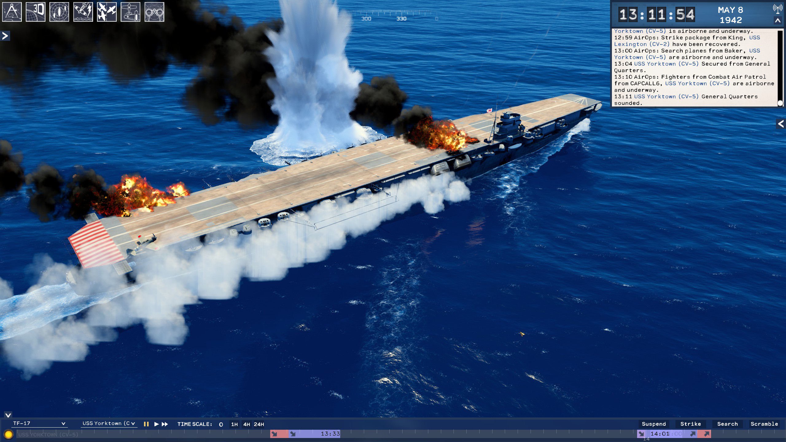 TFA Vol. 1 keskittyy Tyynenmeren tukialussotaan ja tässä vaiheessa aivan sen alkuosaan. Peli on vasta julkaistu Early Accessiin, joten siinä on tällä haavaa vain erittäin niukka slaissi sisältöä. Mutta se siivu on sen verran vakuuttava, että meikä on myyty. Peli ottaa myös aivan omanlaisensa kulman strategiointiin. Juju on näet nyt hyvinkin historiallinen: pelaaja on amiraali, joka komentaa laivasto-osastoa ja sen taistelutoimintaa suuressa mitassa. Hän ei anna pikkukäskyjä. Pelaaja lähettää taivaalle tiedustelukoneita, ohjaa laivasto-osastojaan ja määrää tukialusten iskuista. Niistä suurista toimista. Mutta kun koneet on lähetetty tehtävälle, niin sitten ei auta kuin odottaa. Montako konetta tulee takaisin? Saatiinko osumia? Tuleeko sieltä vastustajan kostoisku?
