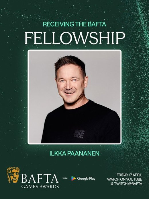 Supercellin toimitusjohtaja Ilkka Paananen palkittiin tänä vuonna Baftojen Fellowship-erityispalkinnolla. Fellowship myönnetään poikkeuksellisille ihmisille, jotka ovat edistäneet merkittävästi innovaatioita, luovuutta ja positiivista muutosta. Palkinnon edellisiin saajiin kuuluu muun muassa Hideo Kojima, Gabe Newell ja Shigeryu Miyamoto.