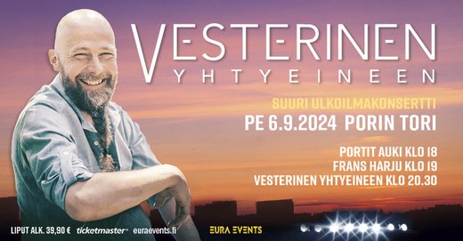 Valtaisaa suosiota nauttiva Vesterinen Yhtyeineen esiintyy Porin Torilla järjestettävässä suuressa ulkoilmakonsertissa perjantaina 6.syyskuuta.