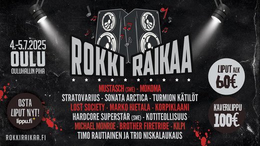 Täysi-ikäisille suunnattu Rokki Raikaa järjestetään Ouluhallin parkkialueella. Festivaali julkistaa nyt 16 artistia, joiden joukossa ovat mm. Turmion Kätilöt, Sonata Arctica, Stratovarius, Michael Monroe ja Ruotsin rock-suuruudet Hardcore Superstar ja Mustasch. Kaksi bändiä/artistia julkistetaan myöhemmin.