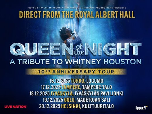 Whitney Houstonin musiikin ystäville on luvassa unohtumattomat illat, kun ylistetty "Queen Of The Night – A Tribute to Whitney Houston" -show palaa Suomeen 10-vuotisjuhlakiertueellaan. Säkenöivä tribuuttikonsertti nähdään joulukuussa Turussa, Tampereella, Jyväskylässä, Oulussa ja Helsingissä.