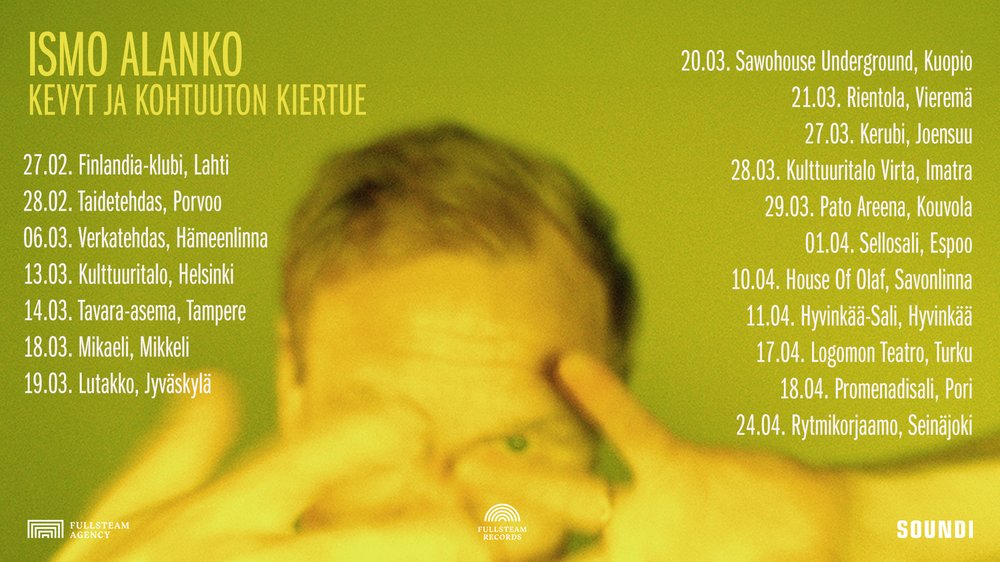 Ismo Alanko kiertää jälleen bändin kanssa. Uutta musiikkia parhaillaan valmisteleva Ismo Alanko konsertoi laajasti halki maan ensi vuonna. "Kevyt ja kohtuuton"- kiertue käynnistyy Lahden Finlandia-klubilta perjantaina 27. helmikuuta. Yhteensä 18 paikkakuntaa kattavan kiertueen lipunmyynti on käynnissä kunkin esiintymispaikan omissa lipunmyyntikanavissa.