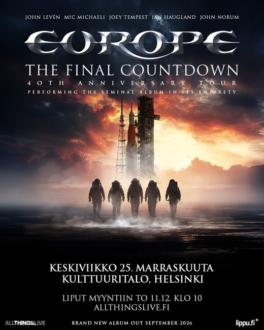 "The Final Countdown 40th Anniversary" -kiertue saapuu myös Suomeen 25. marraskuuta 2026. Helsingin Kulttuuritalossa kuultavan konsertin liput tulevat myyntiin tämän viikon torstaina 11. joulukuuta kello 10.